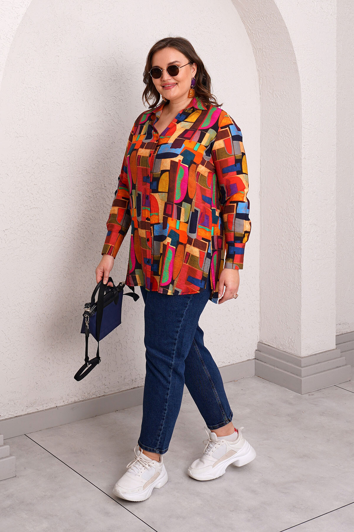 Büyük beden uzun kollu desenli vintage gömlek.