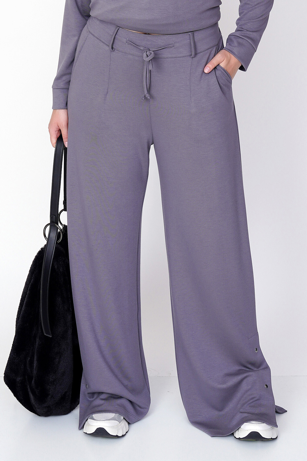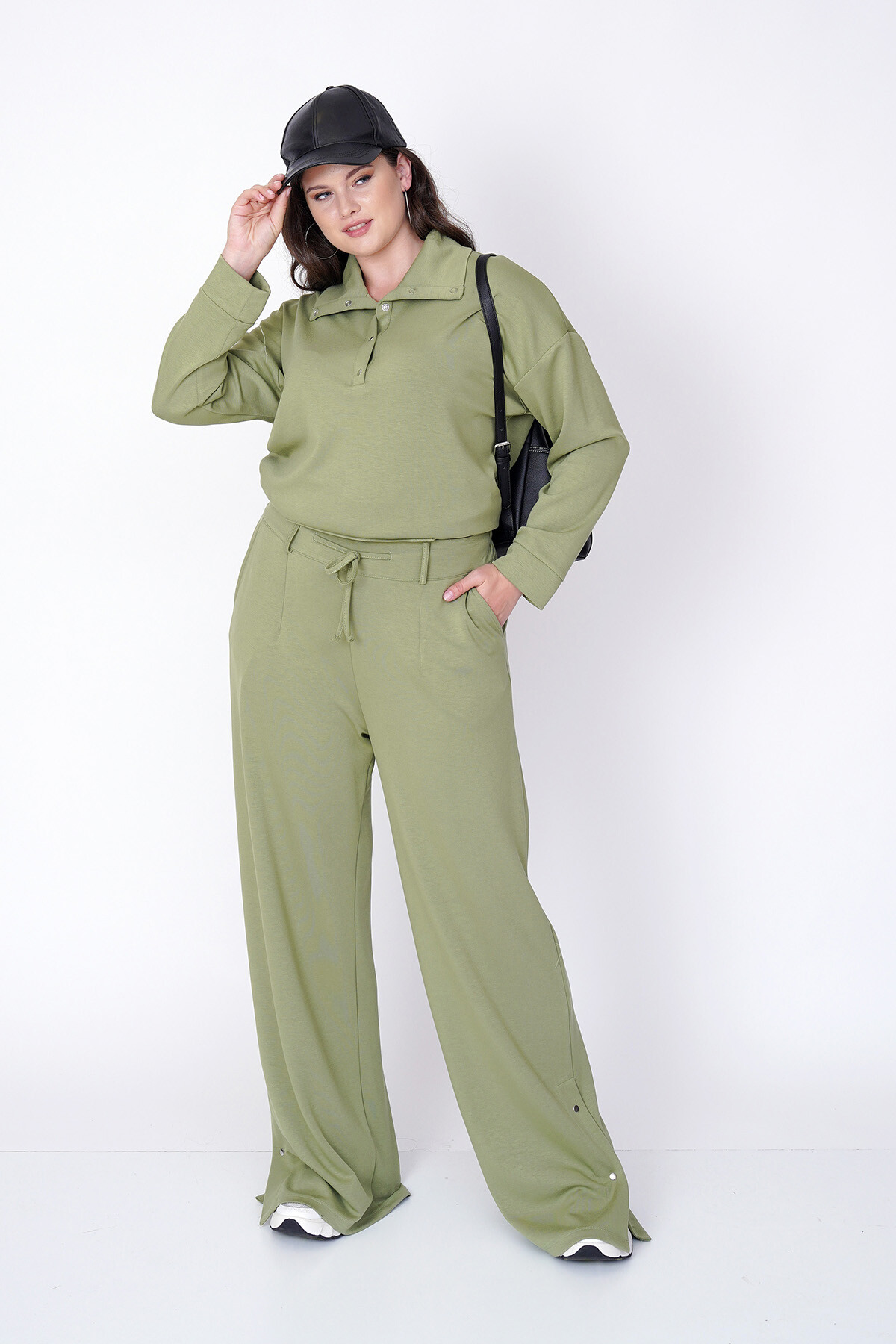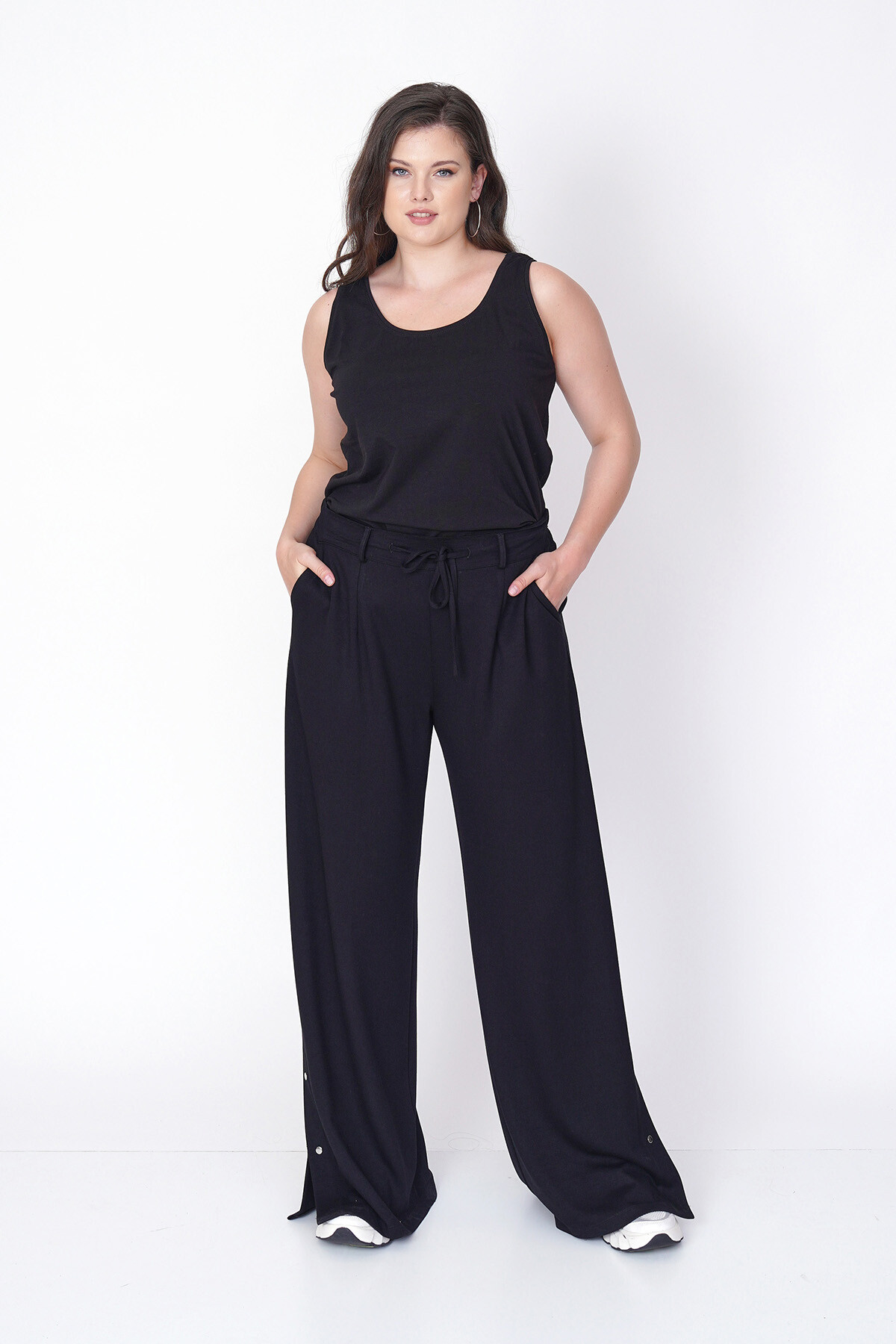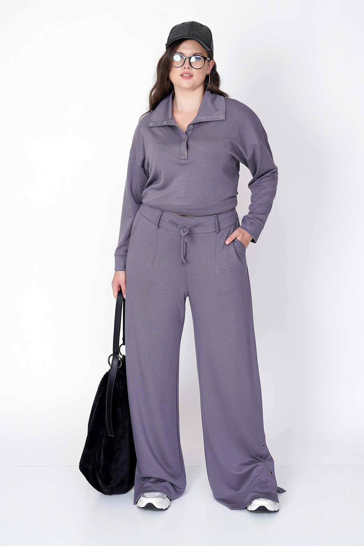 Geniş paça tasarımlı olup paçalarında çıtçıt detayları bulunmaktadır, isteğe göre açılıp kapanabilir.