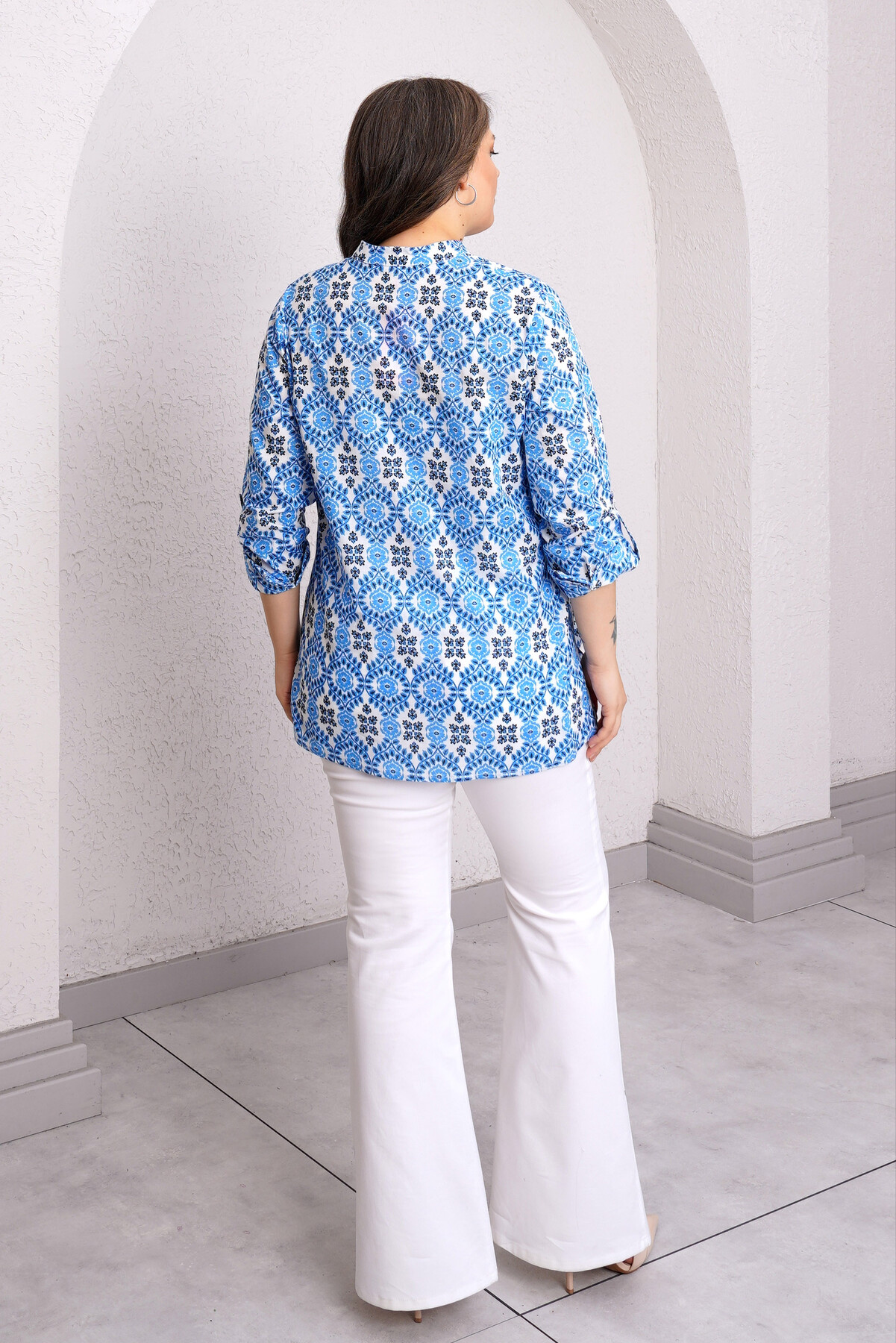 Büyük beden hakim yaka desenli bluz.