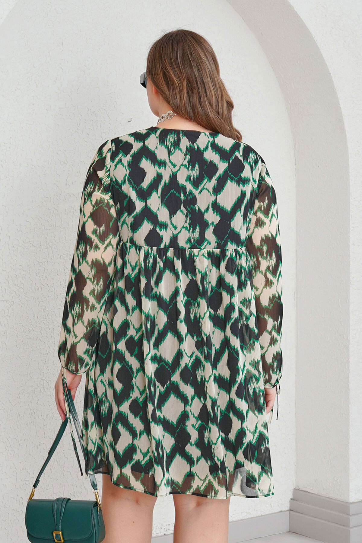 Büyük beden desenli dökümlü şifon kumaştan elbise.