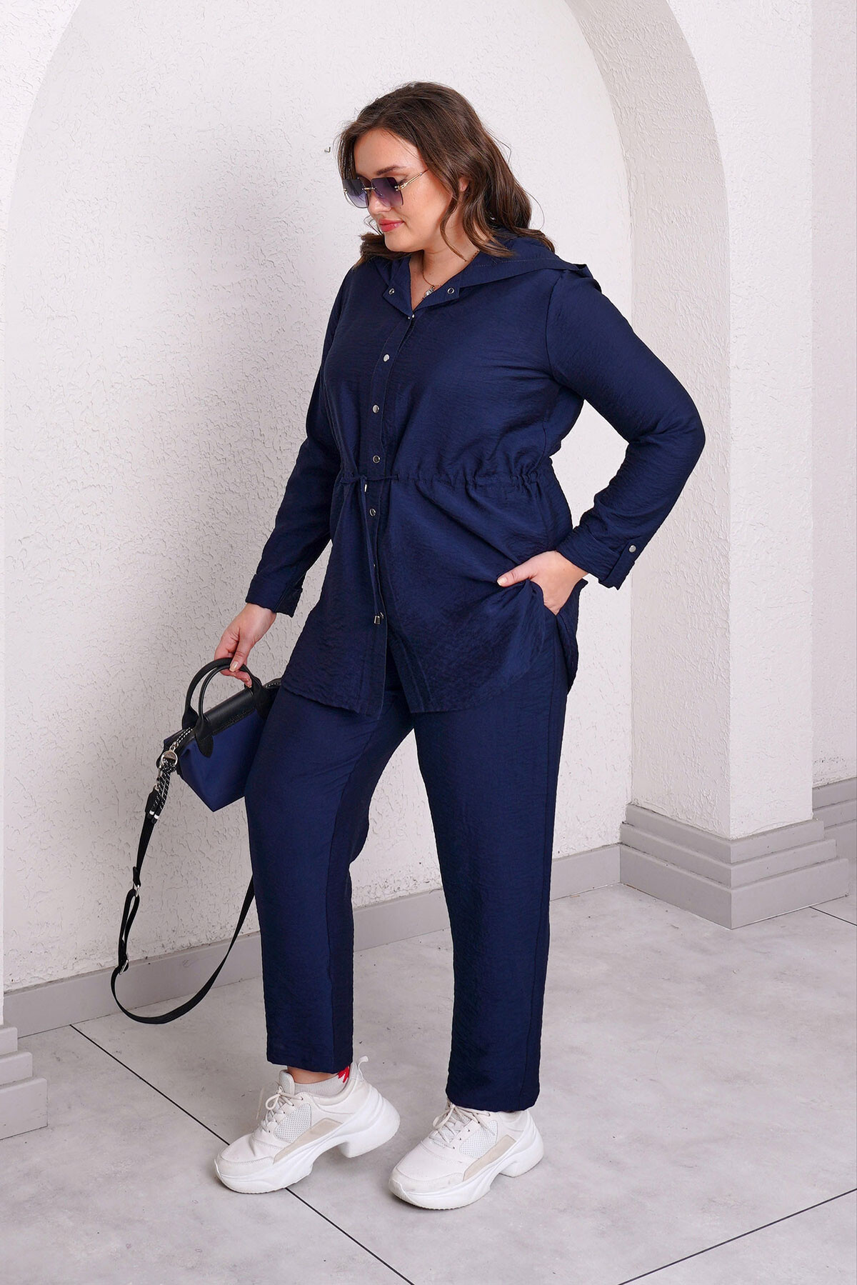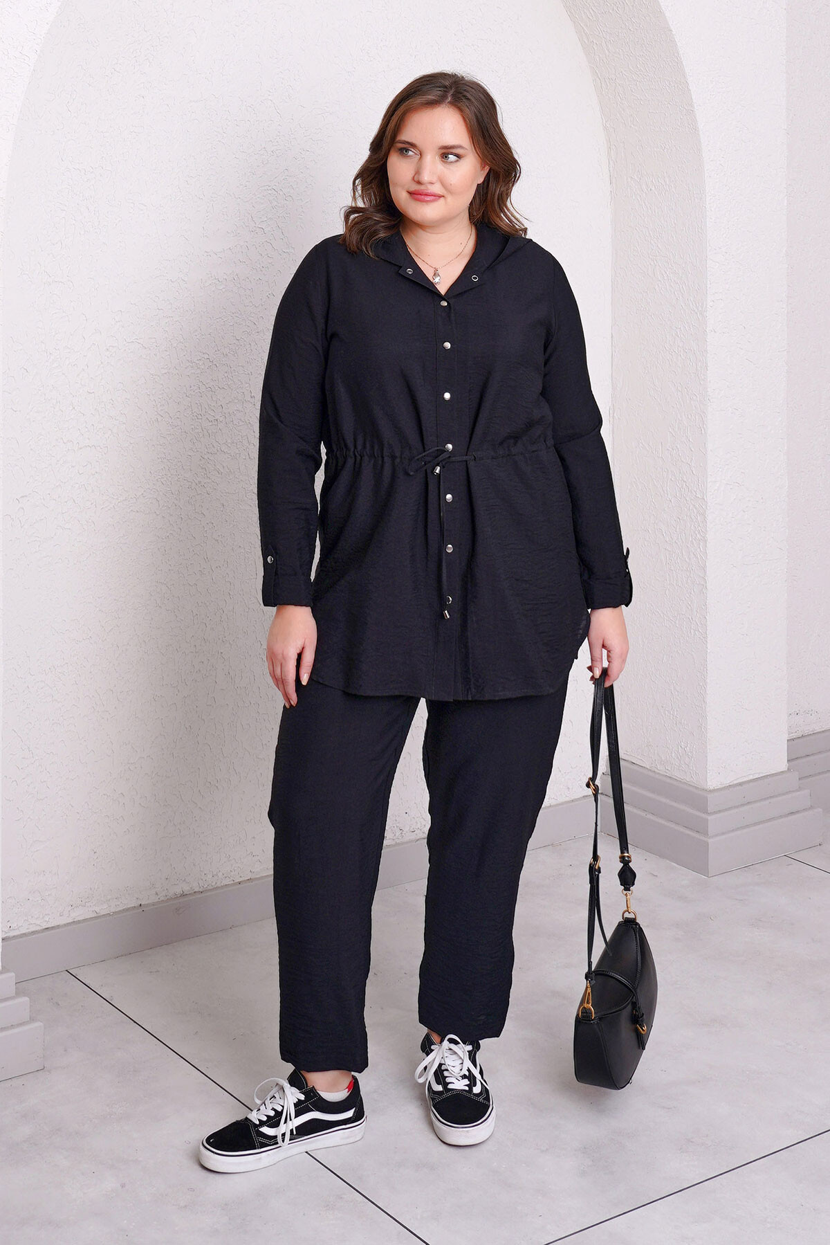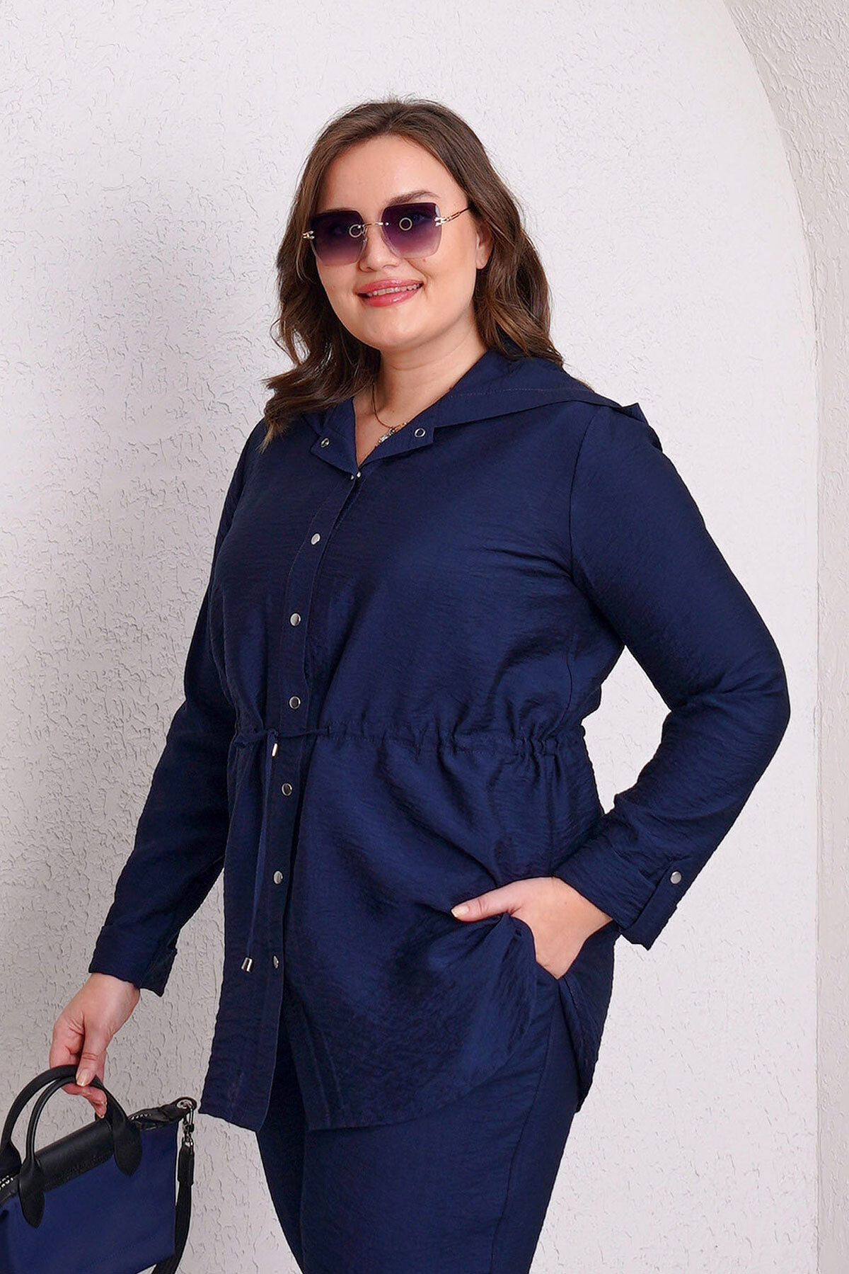 Büyük beden beli ayarlanabilir lastikli ve bağcıklı, çıtçıt kapamalı kapüşonlu ceket.