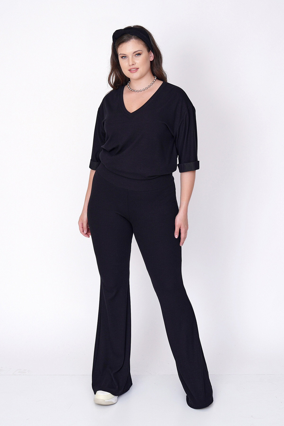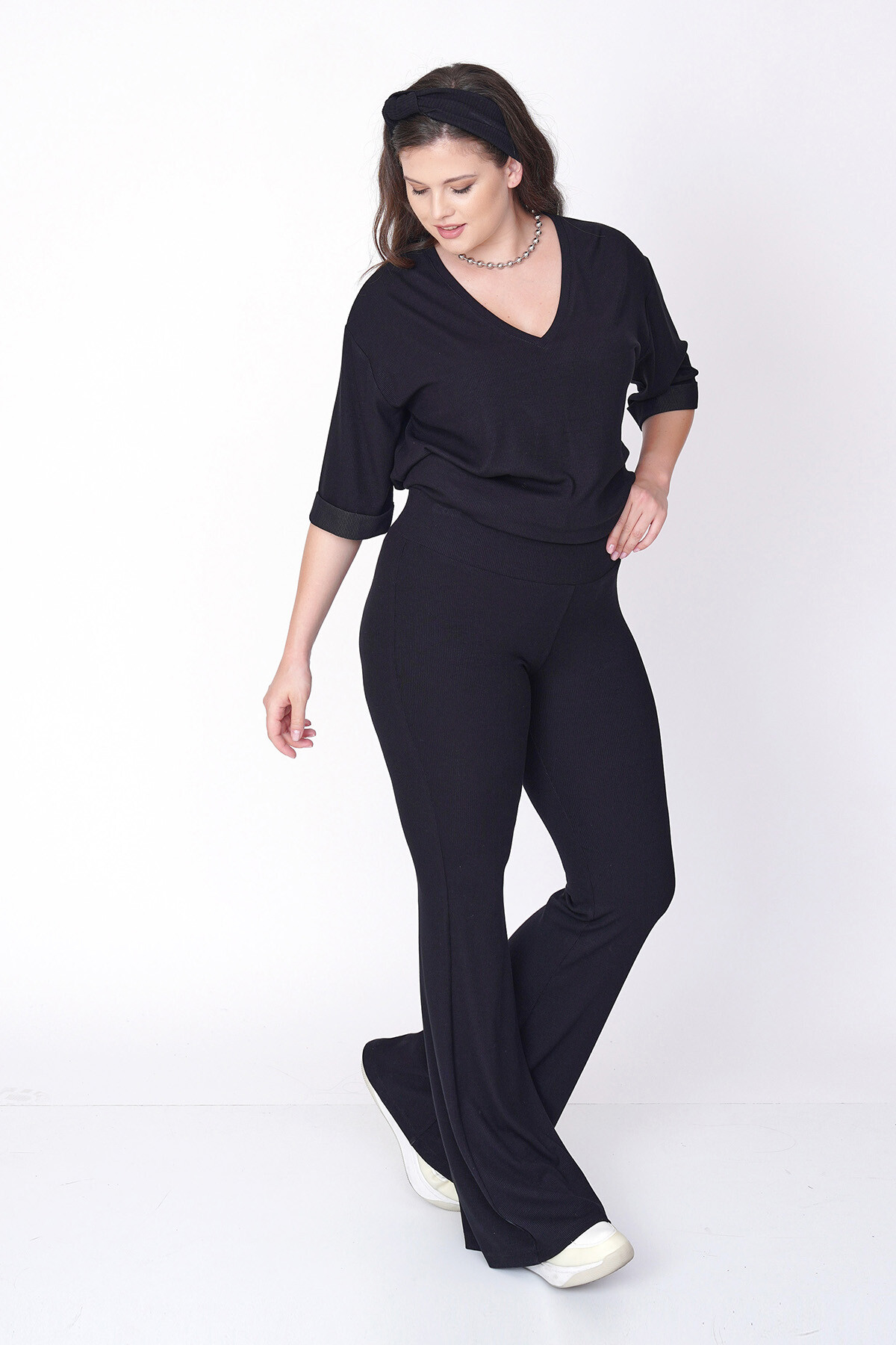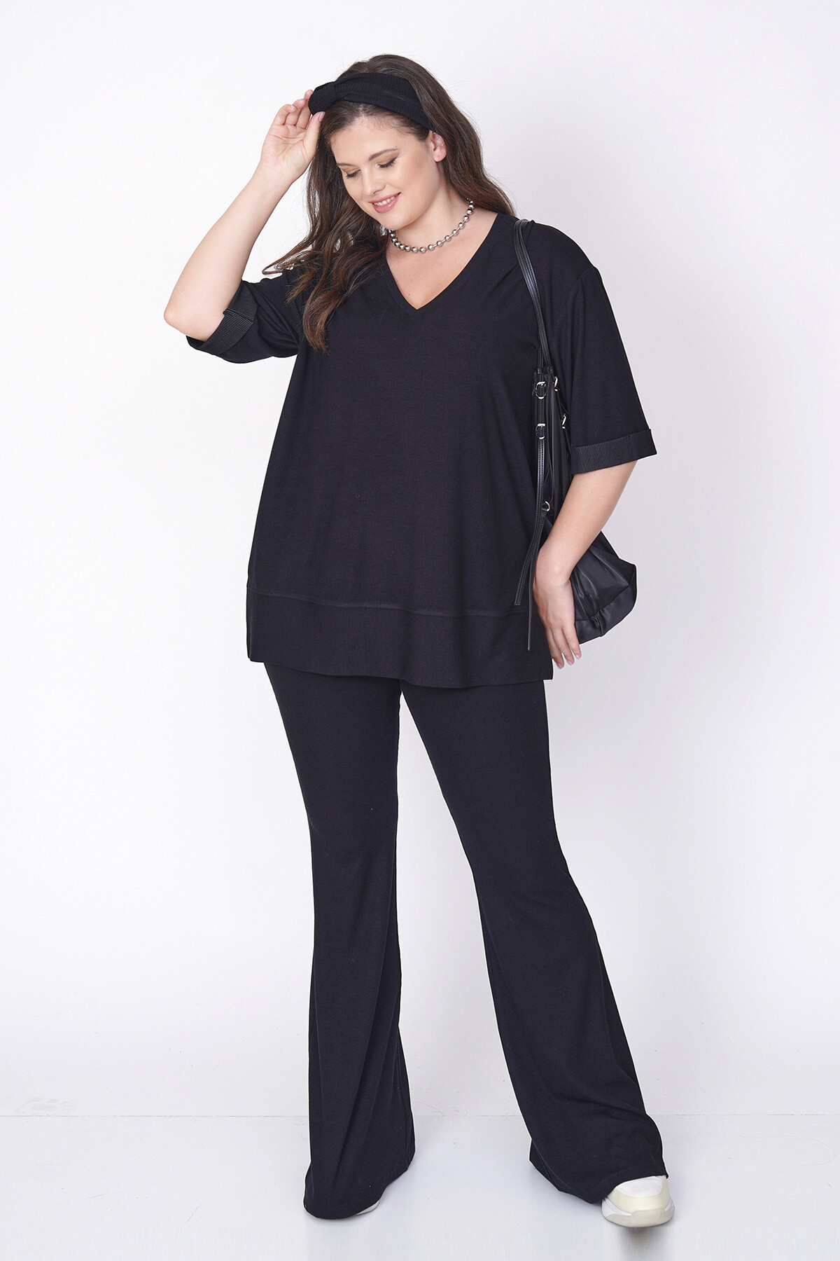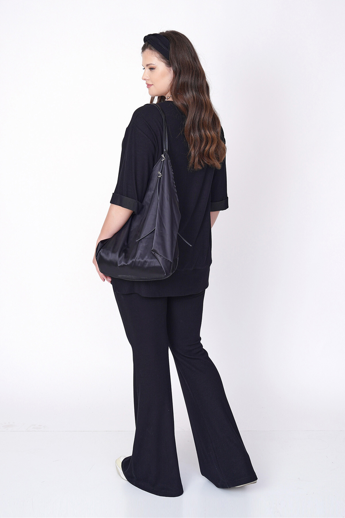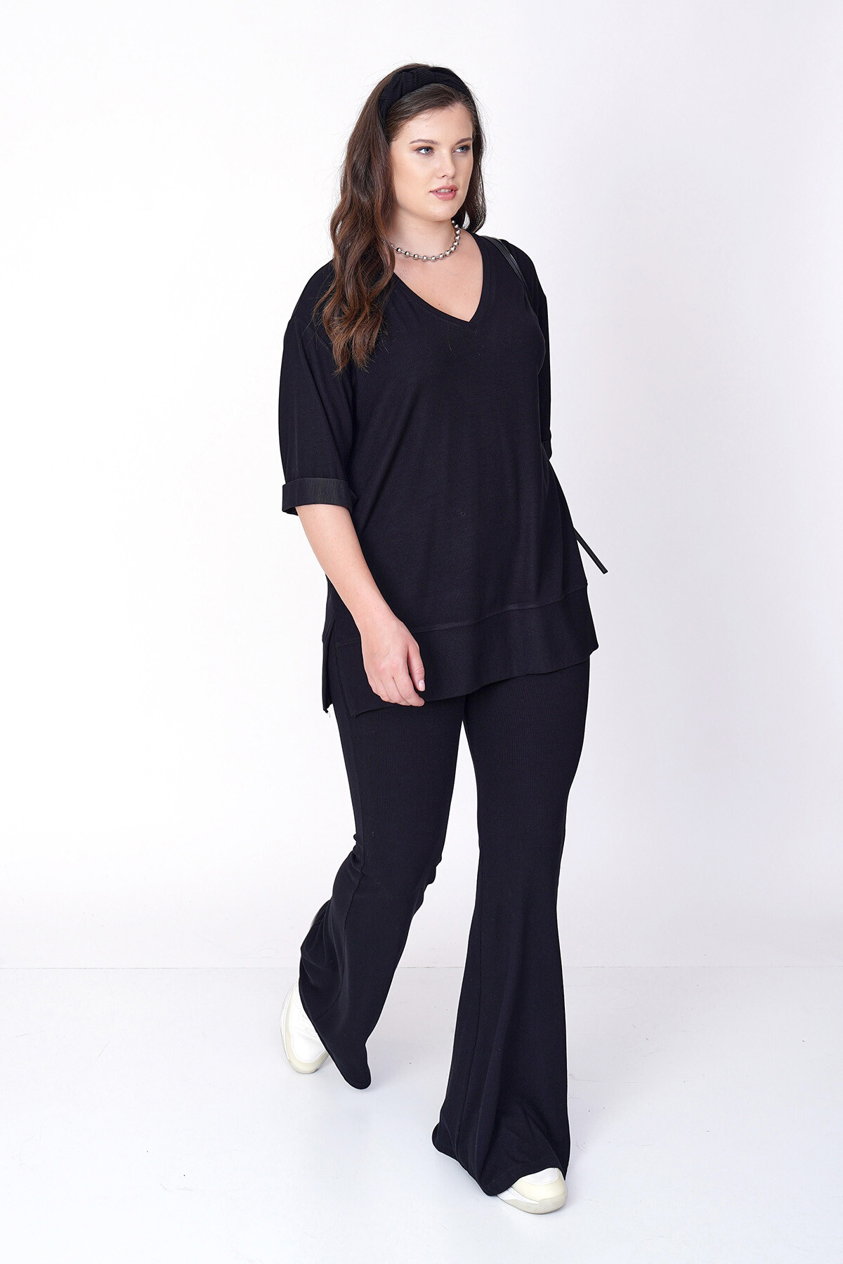 Üst parça V yaka, yarım kol; kolları katlı manşet detaylıdır. Yanları yırtmaçlı, rahat kalıptır.