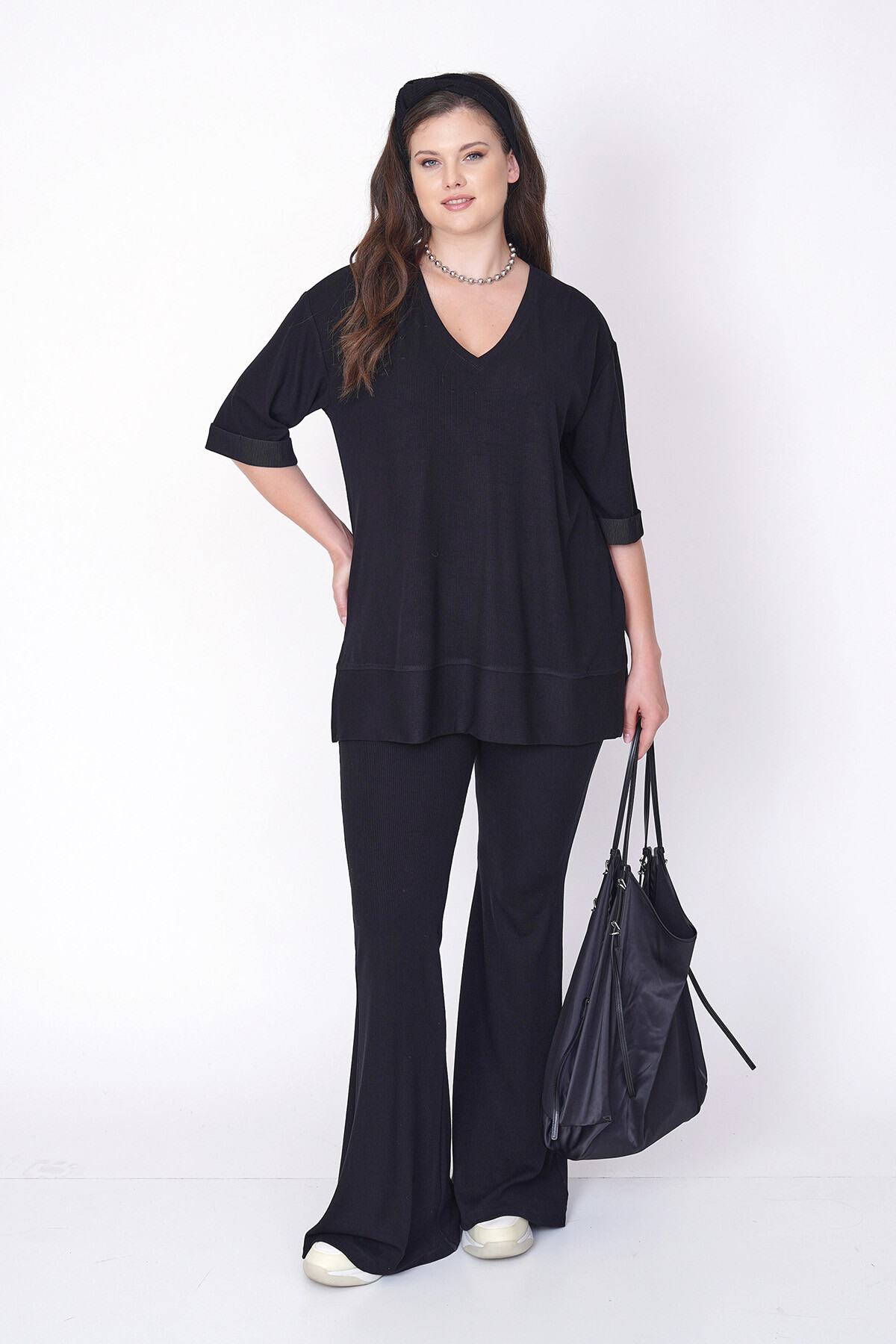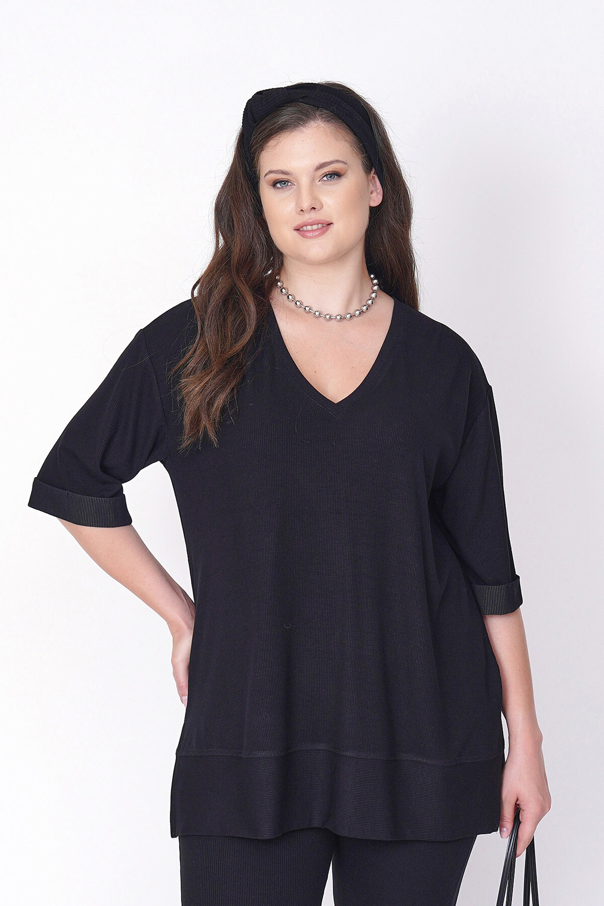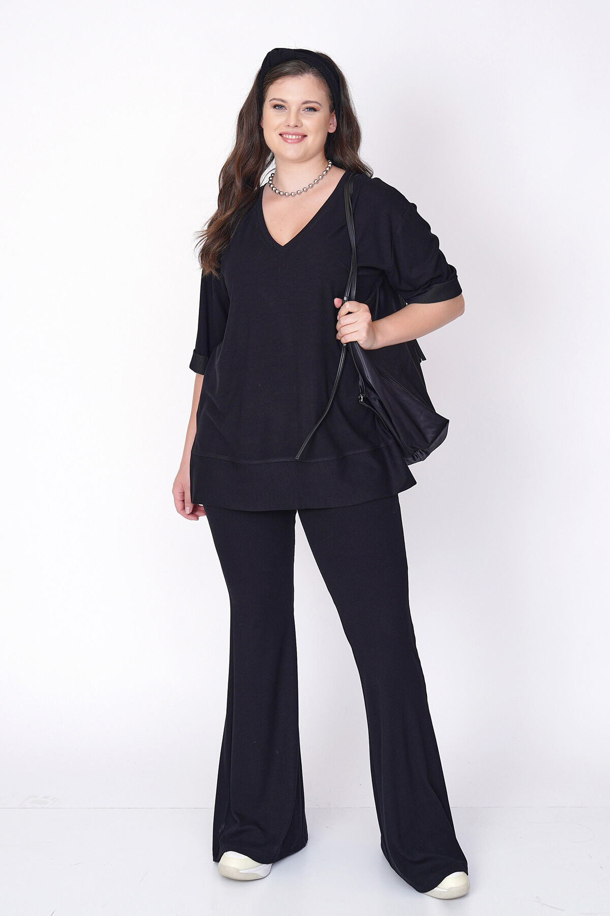 Büyük beden fitilli kaşkorse esnek kumaştan, tişört ve tayt takım, set. (2 ürün)