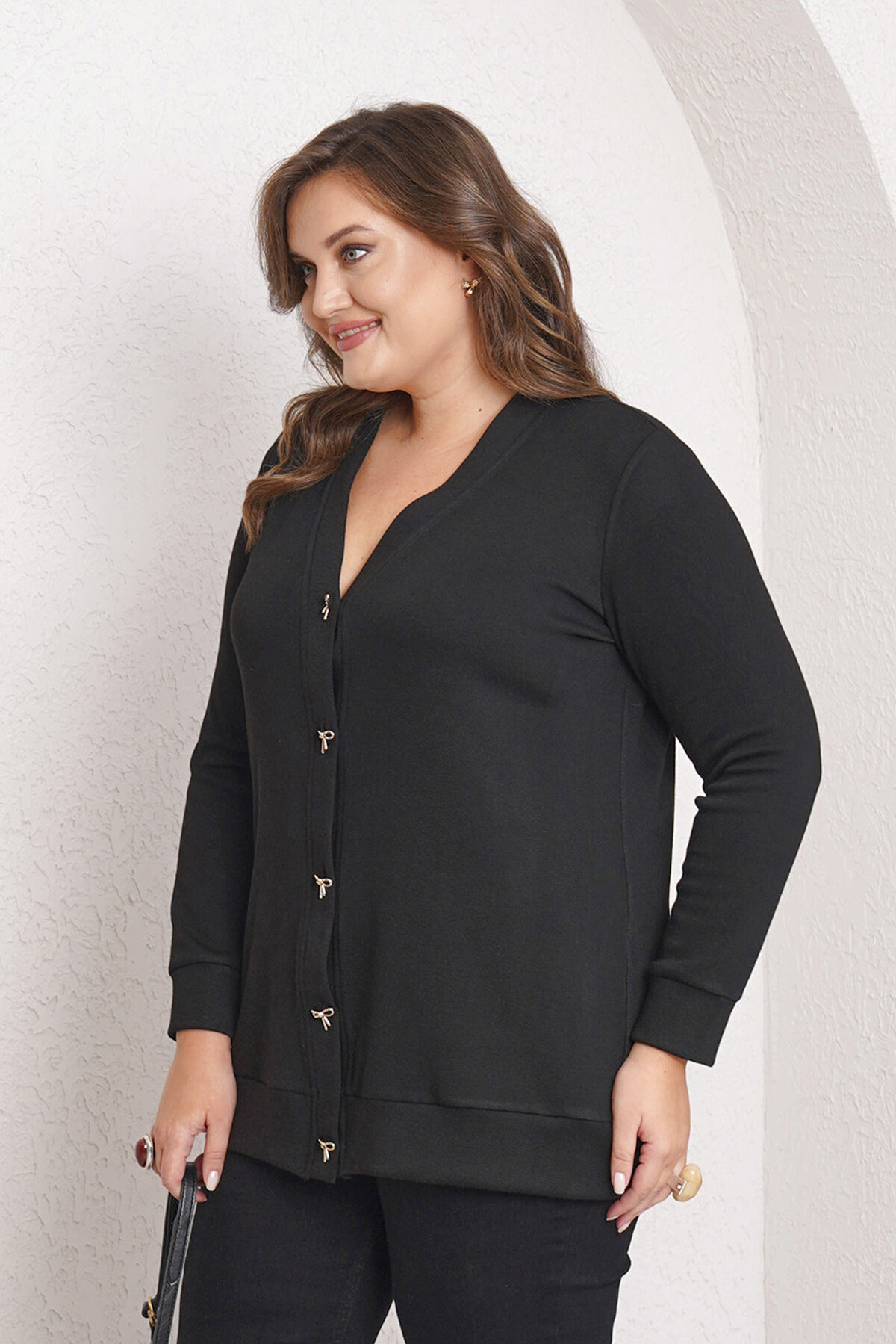 Büyük beden uzun kollu ve manşetli, V-yaka triko hırka.