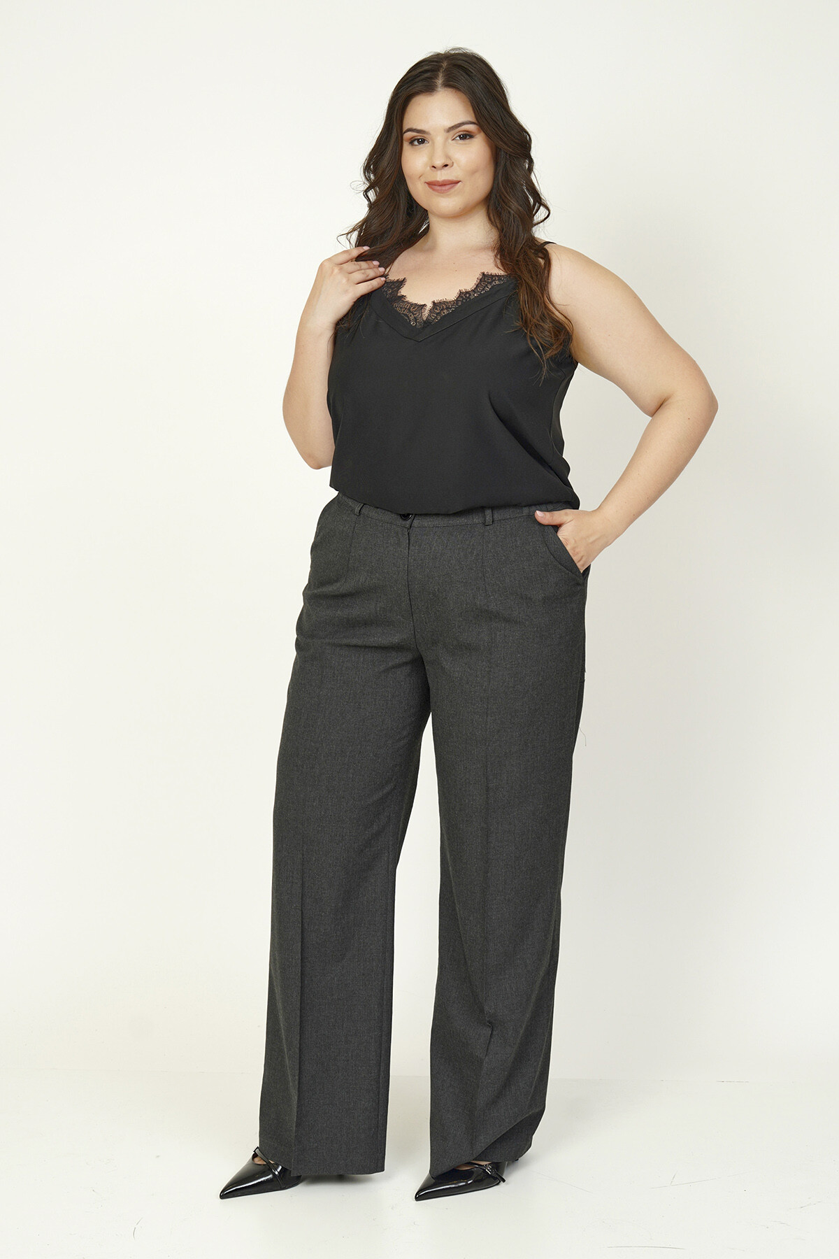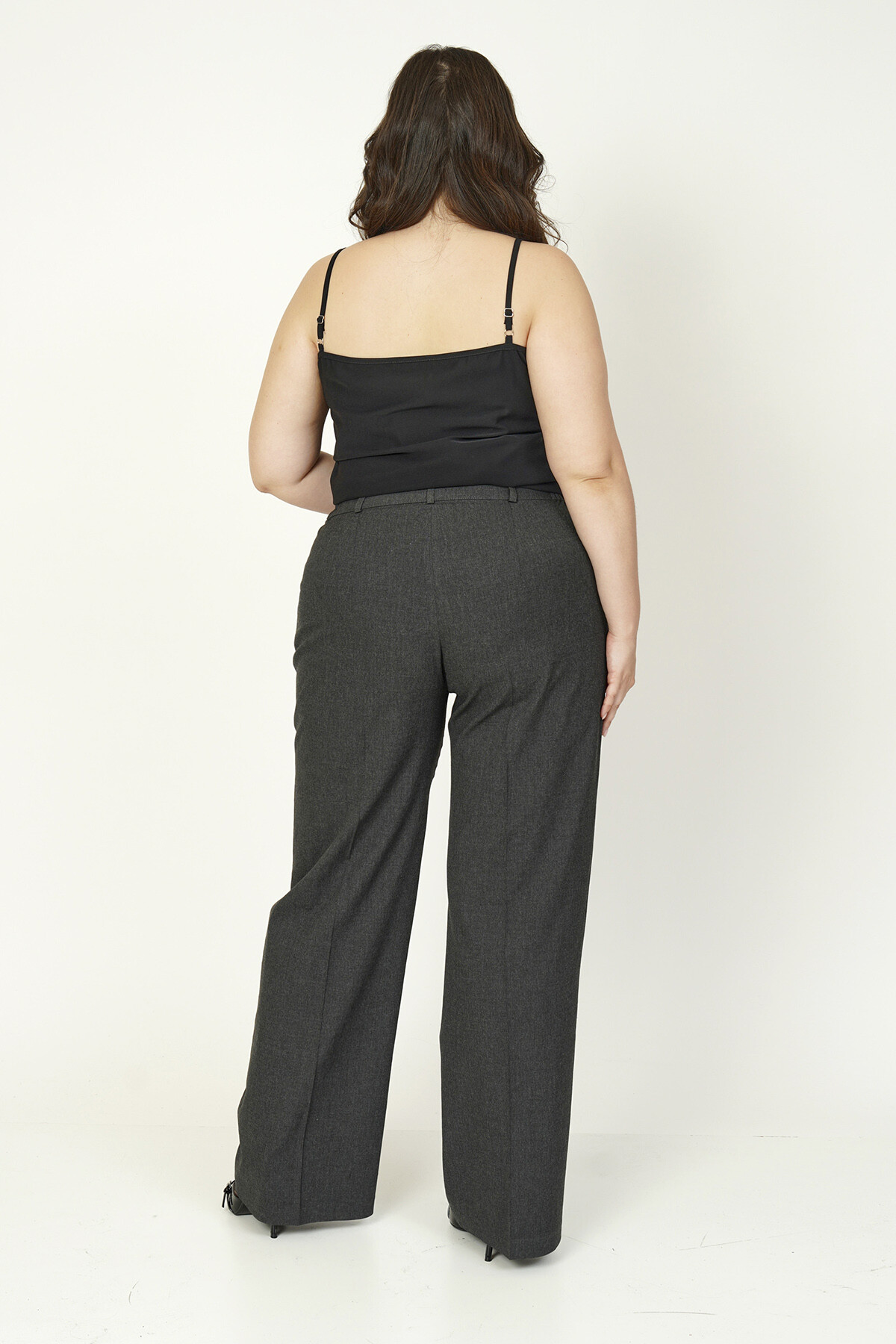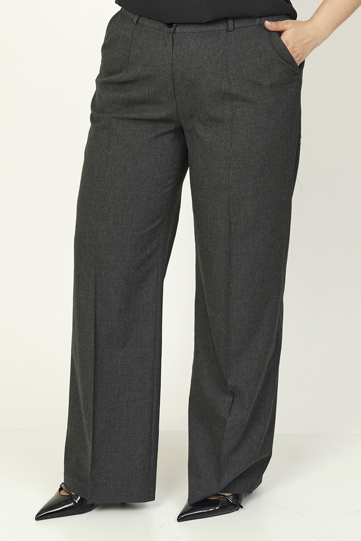 Büyük beden geniş paça, yanlardan cepli, yüksek bel kalın kumaş pantolon.