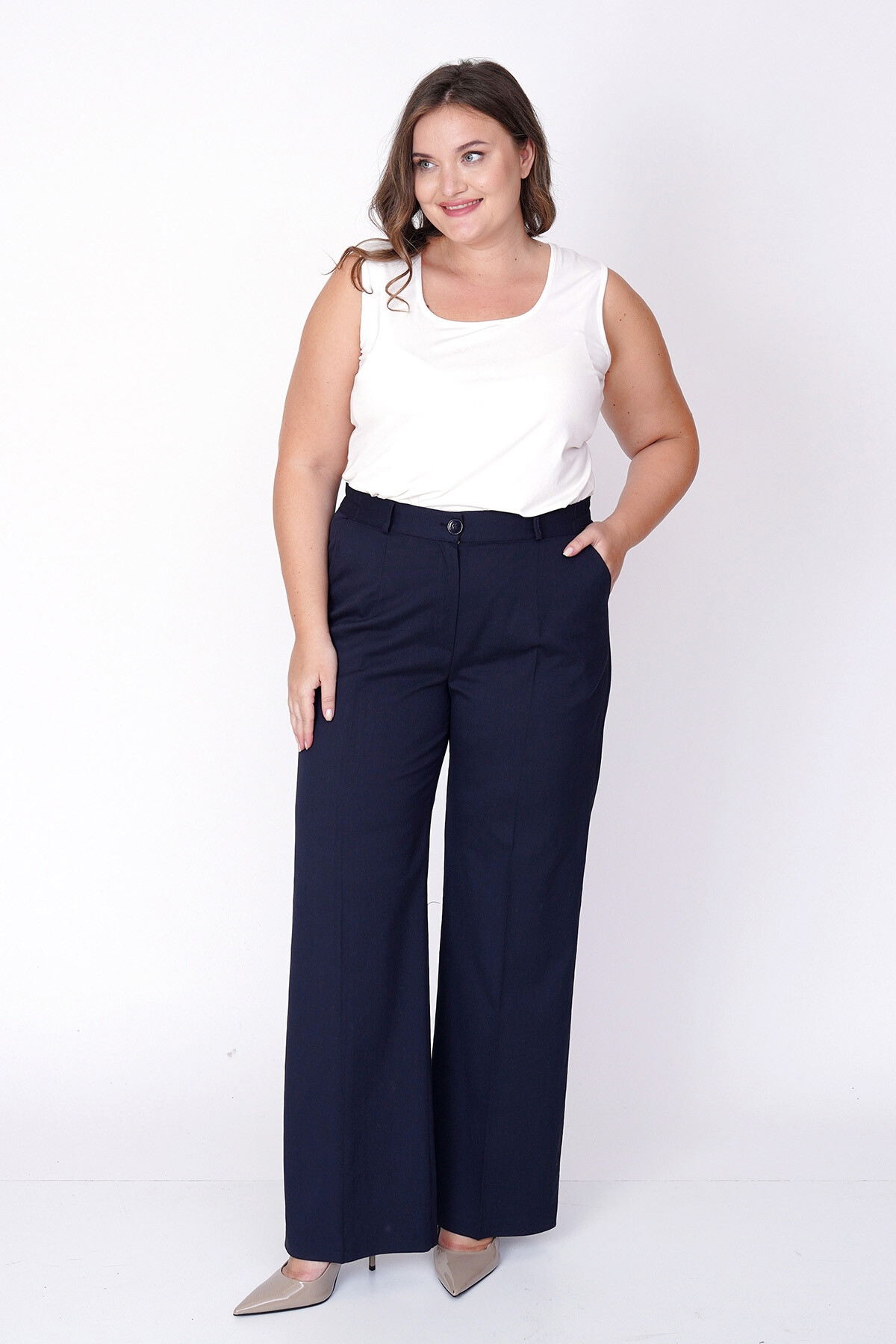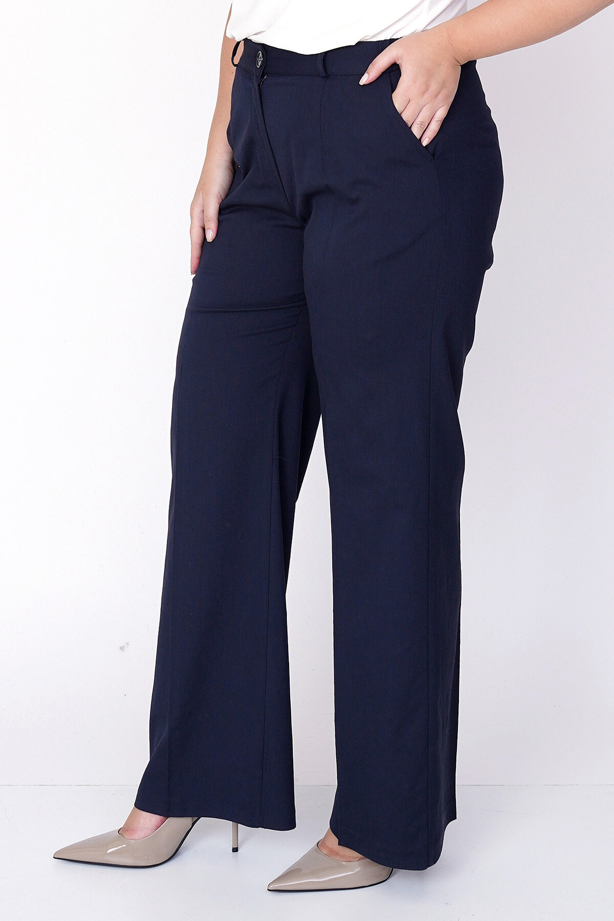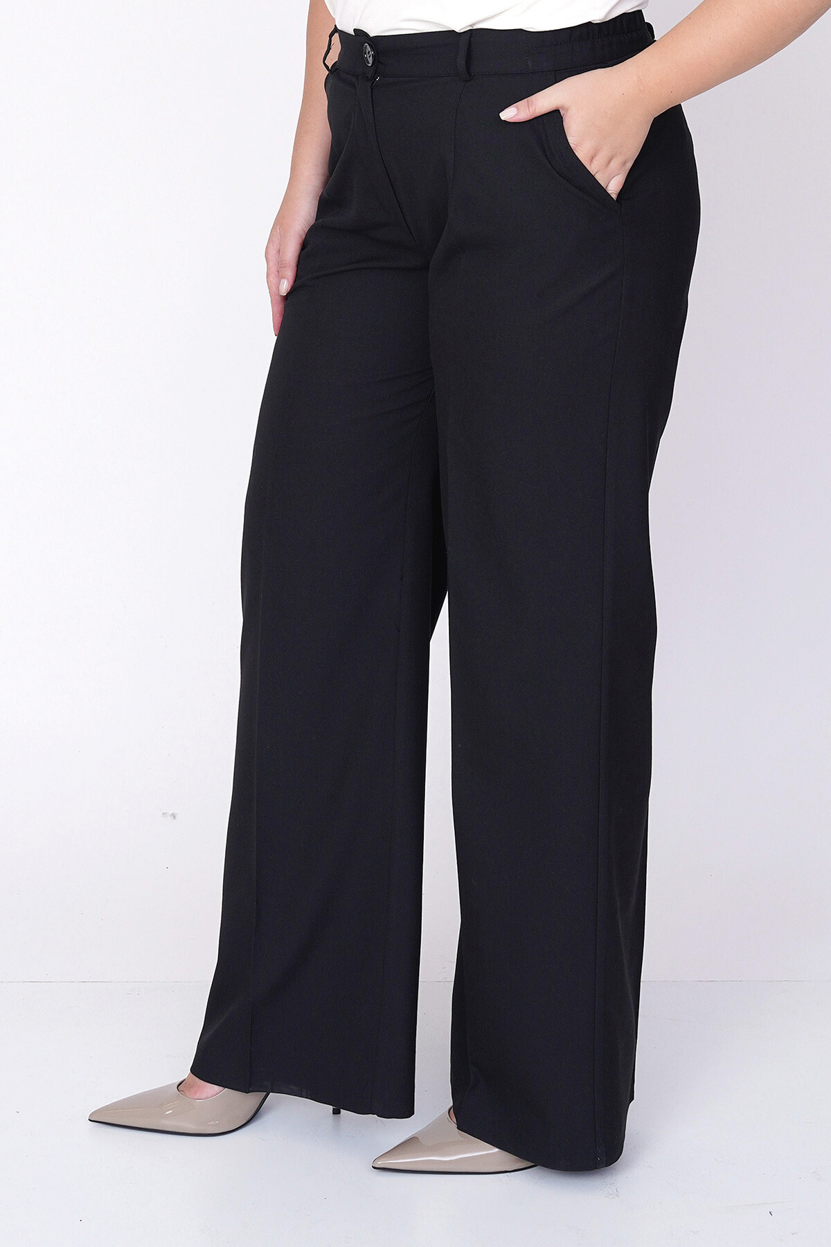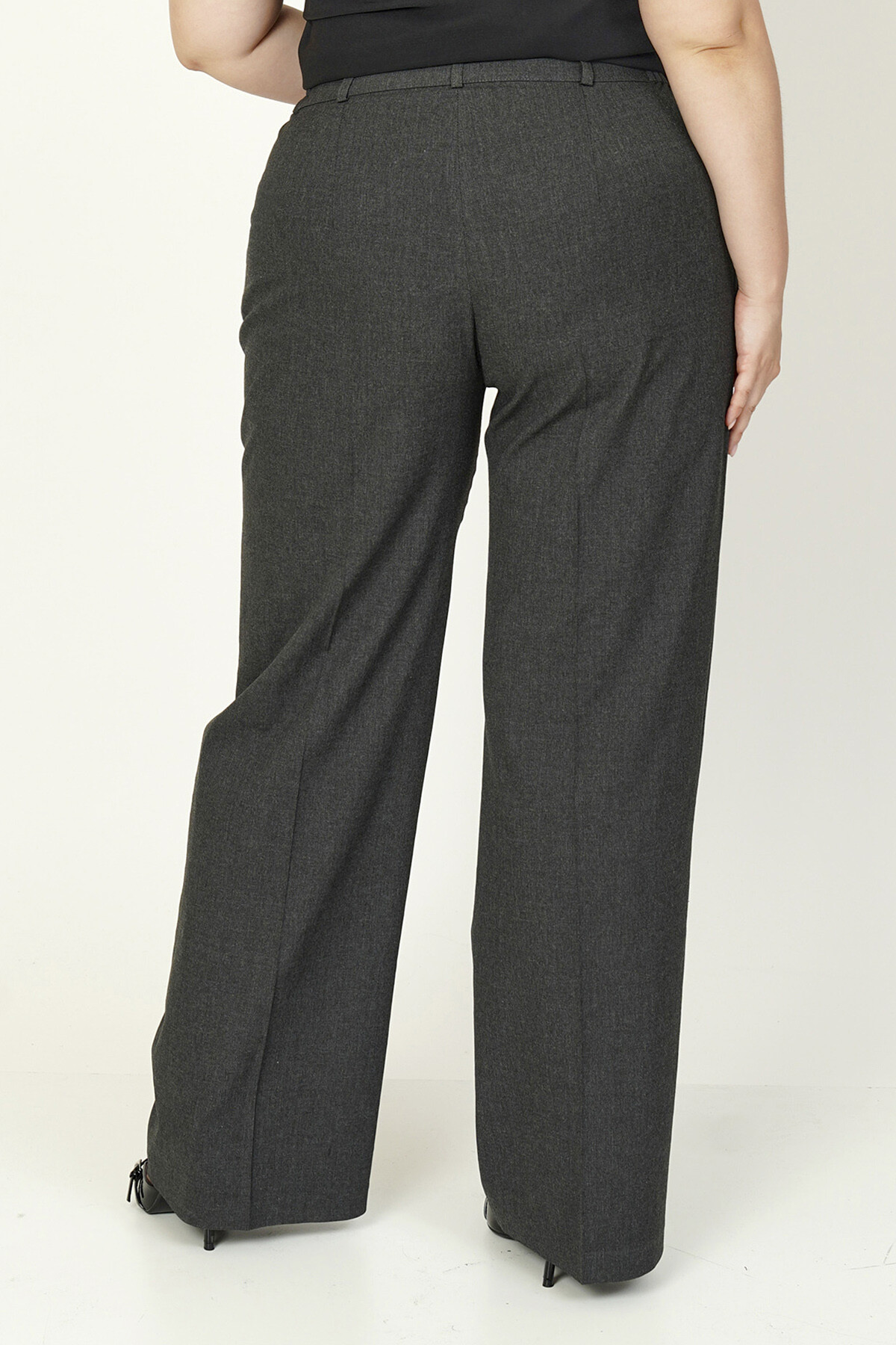 Büyük beden geniş paça, yanlardan cepli, yüksek bel kalın kumaş pantolon.