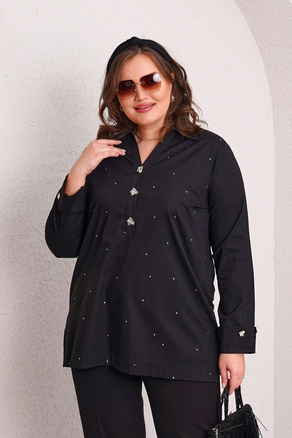 Büyük beden, önü ve kol uçları kalp aksesuar düğmeli, kalın manşetli, taş baskılı likralı poplin bluz.