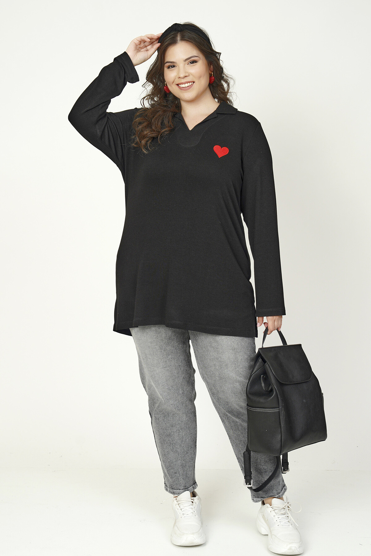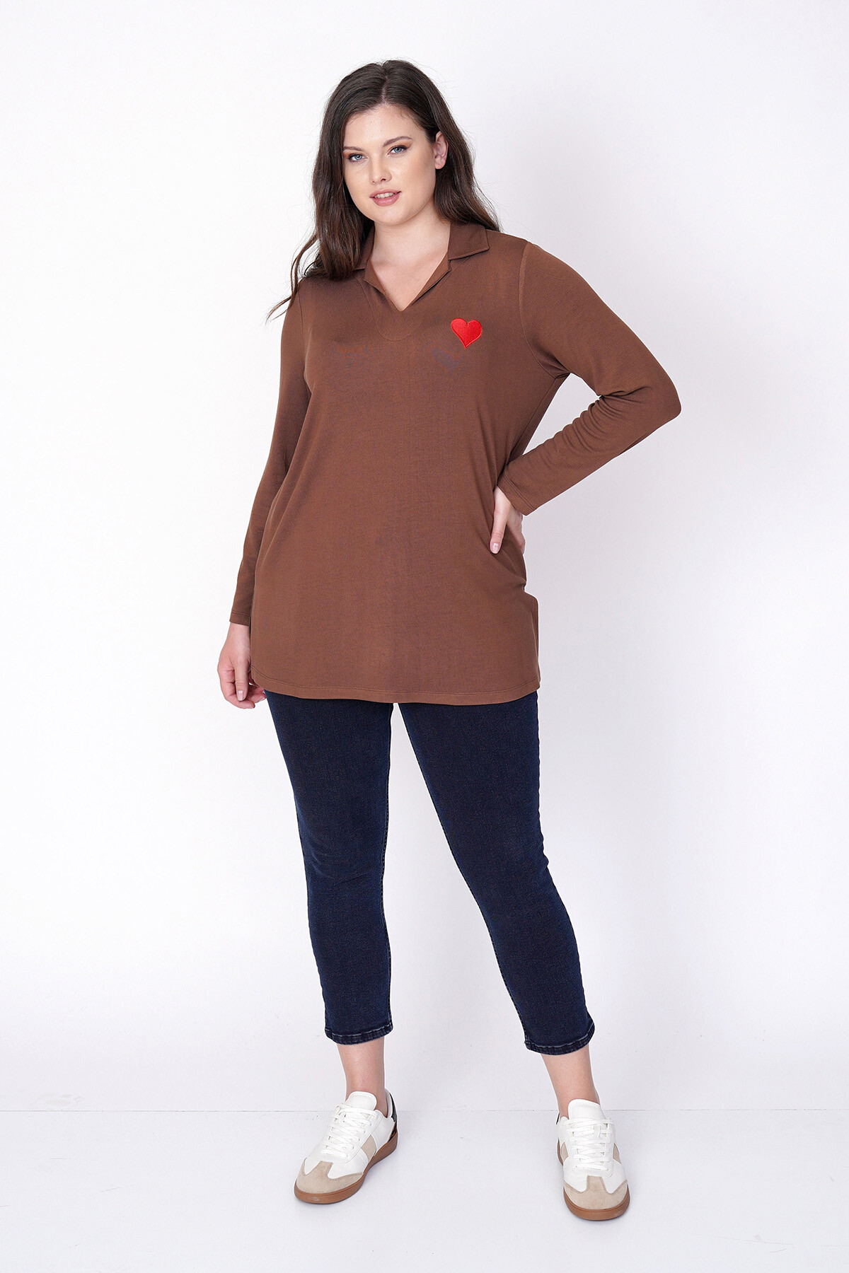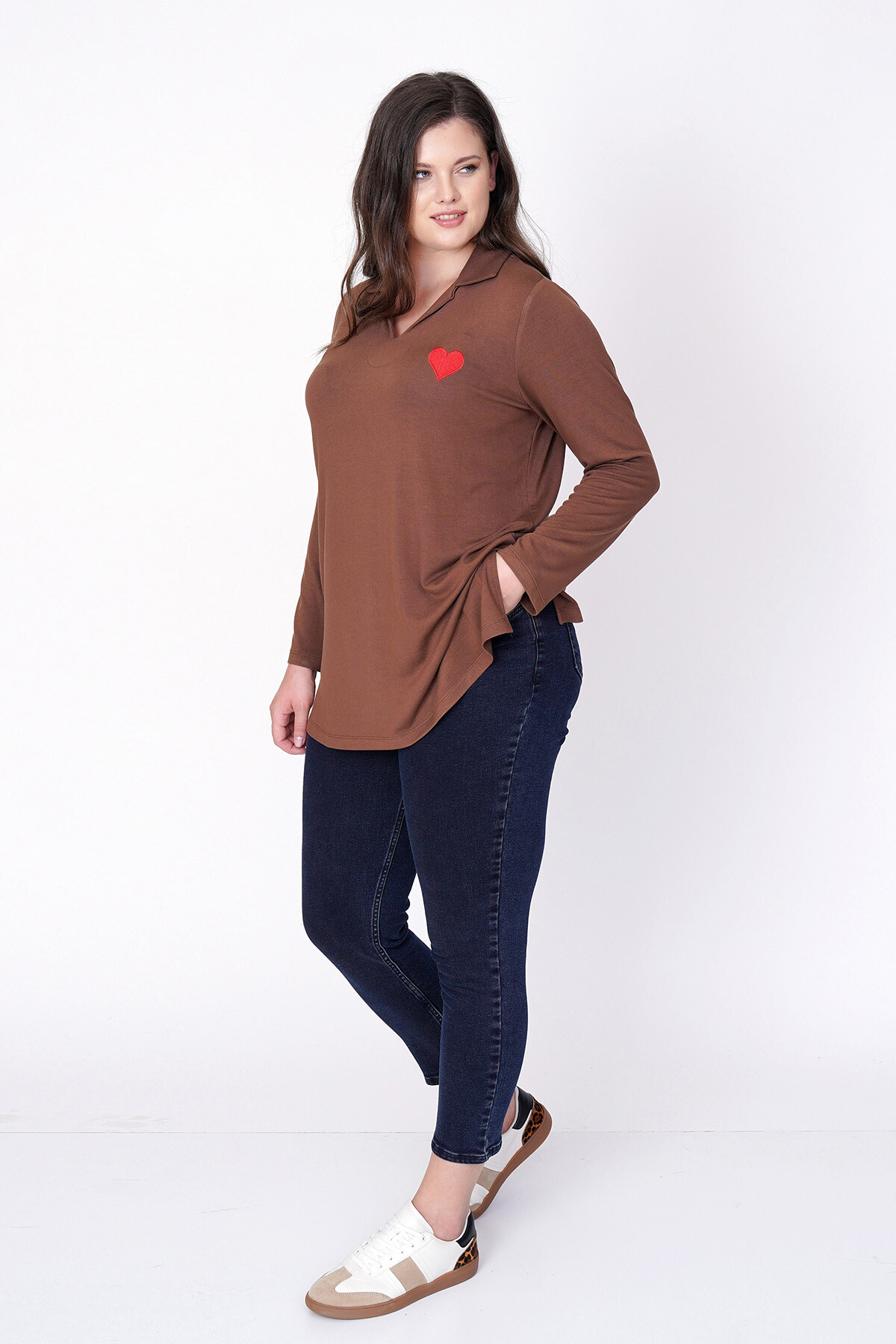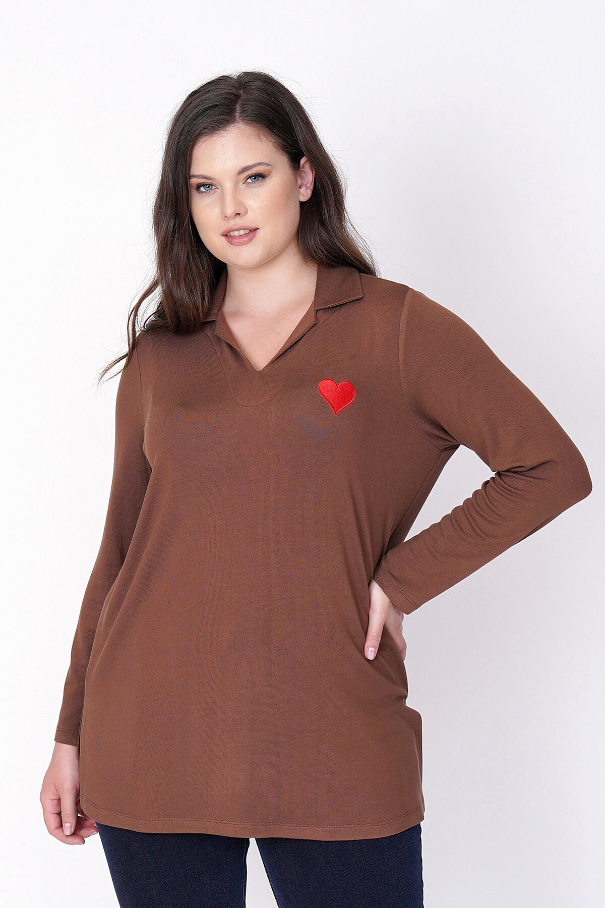 Büyük beden kalp nakışlı, uzun kollu ve V-yaka triko bluz.