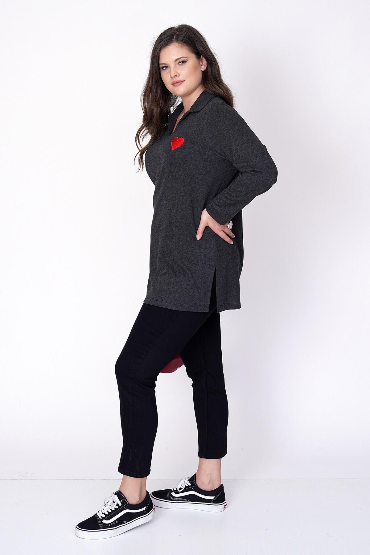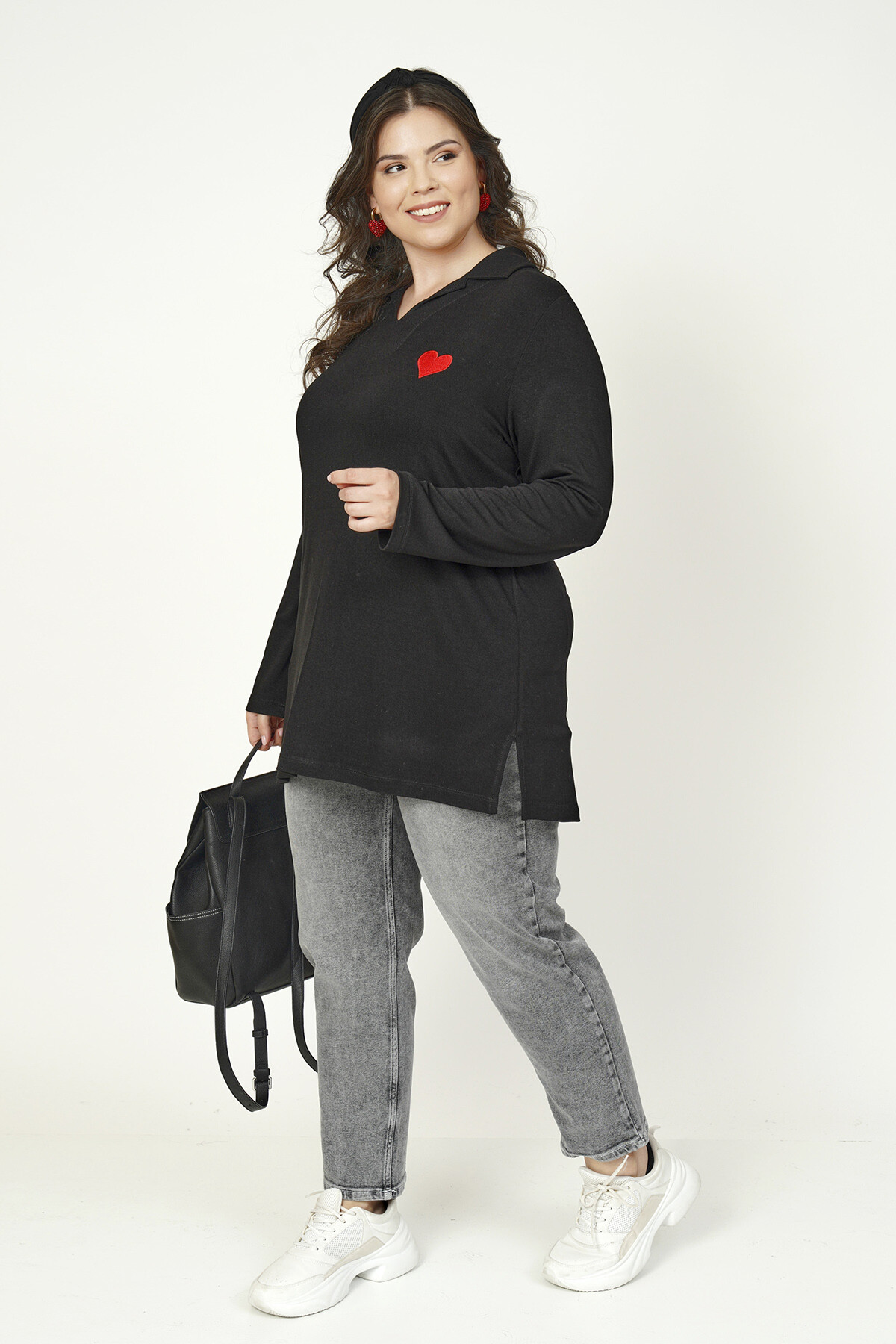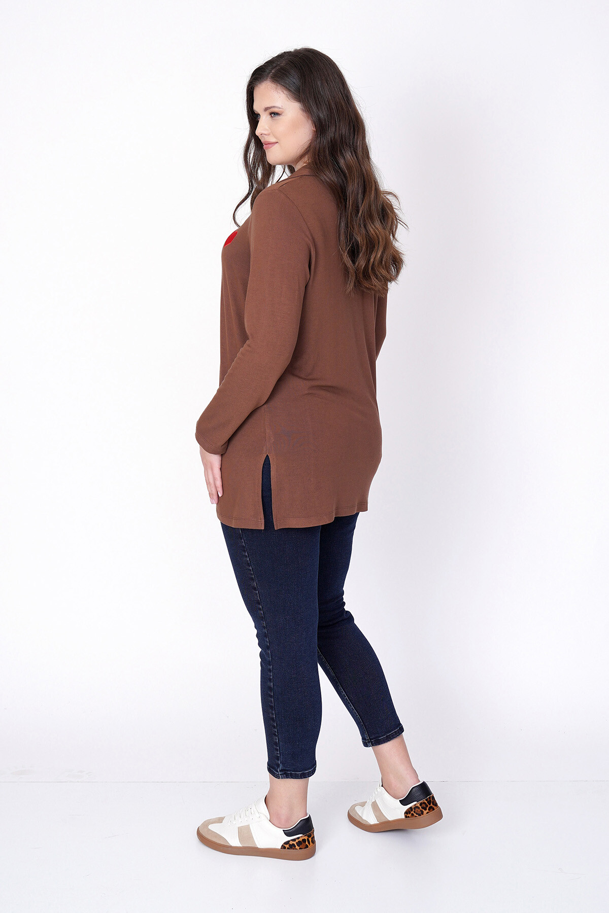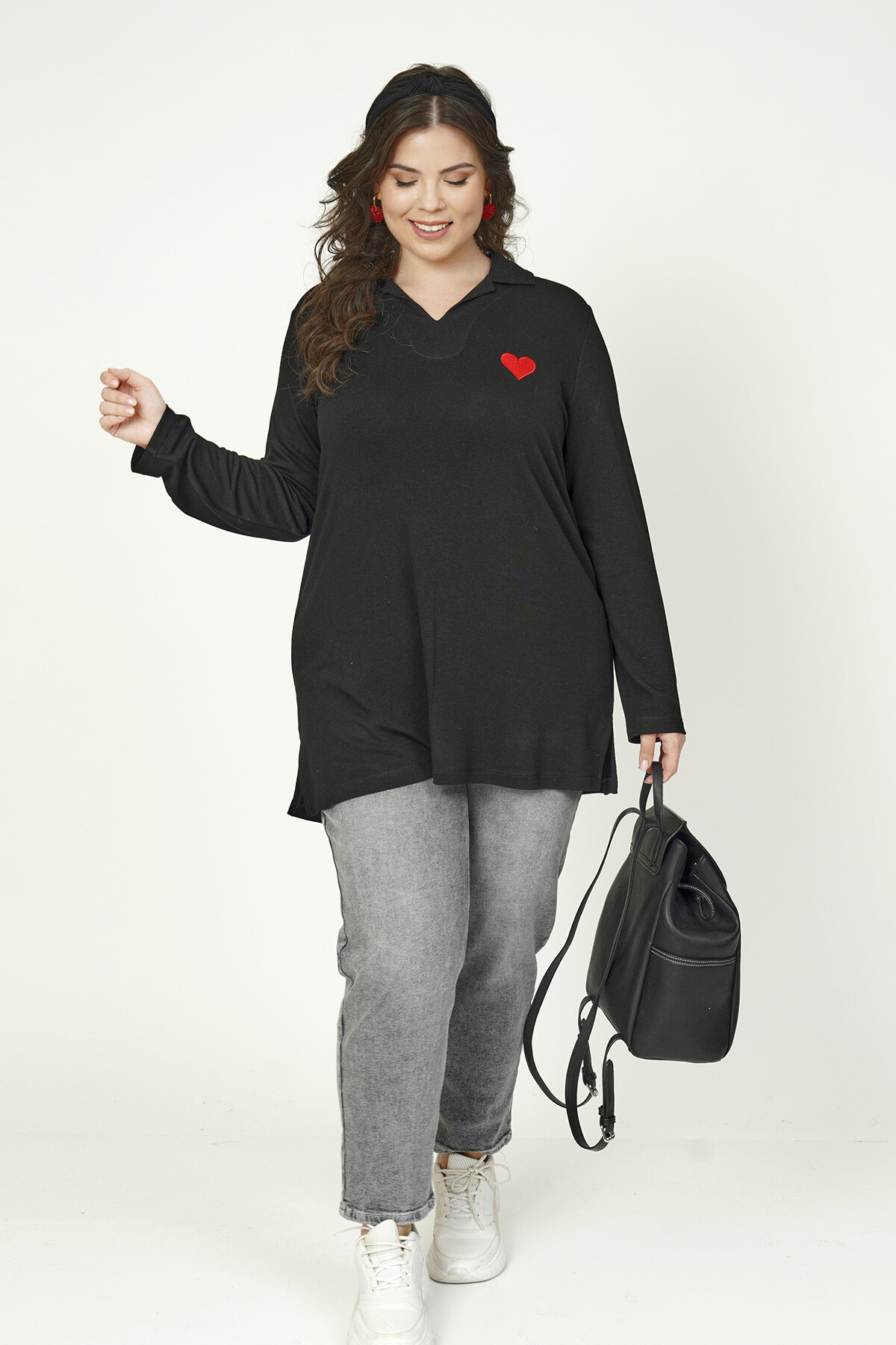 Büyük beden kalp nakışlı, uzun kollu ve V-yaka triko bluz.