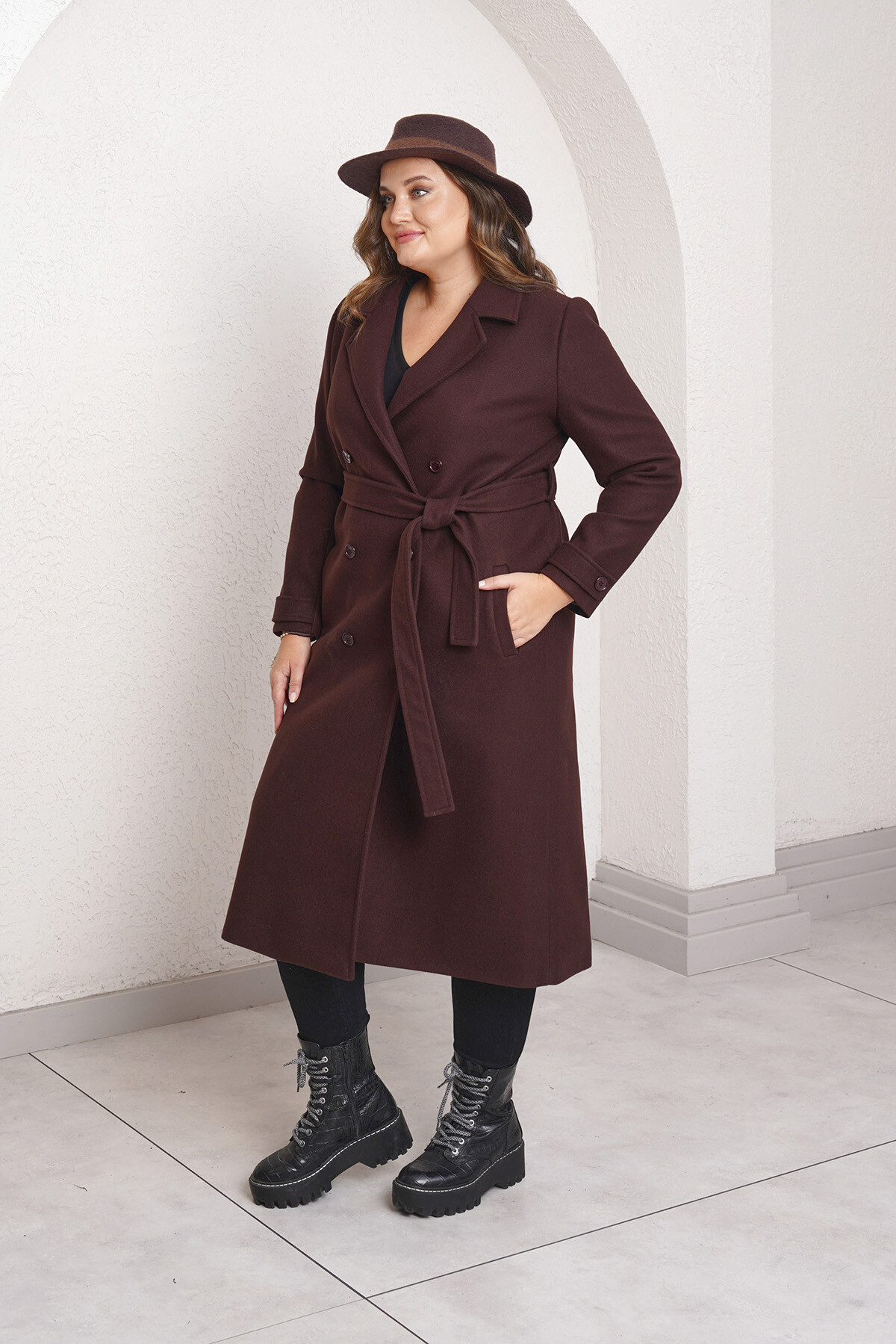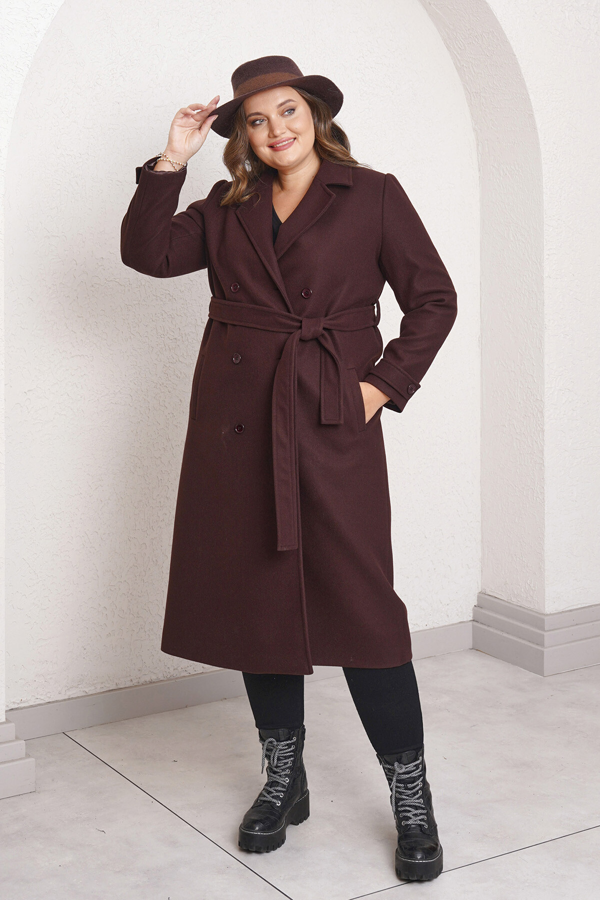 Büyük beden uzun kollu, geniş yaka, kruvaze ön kapamalı ve düğmeli uzun kaşe kaban.