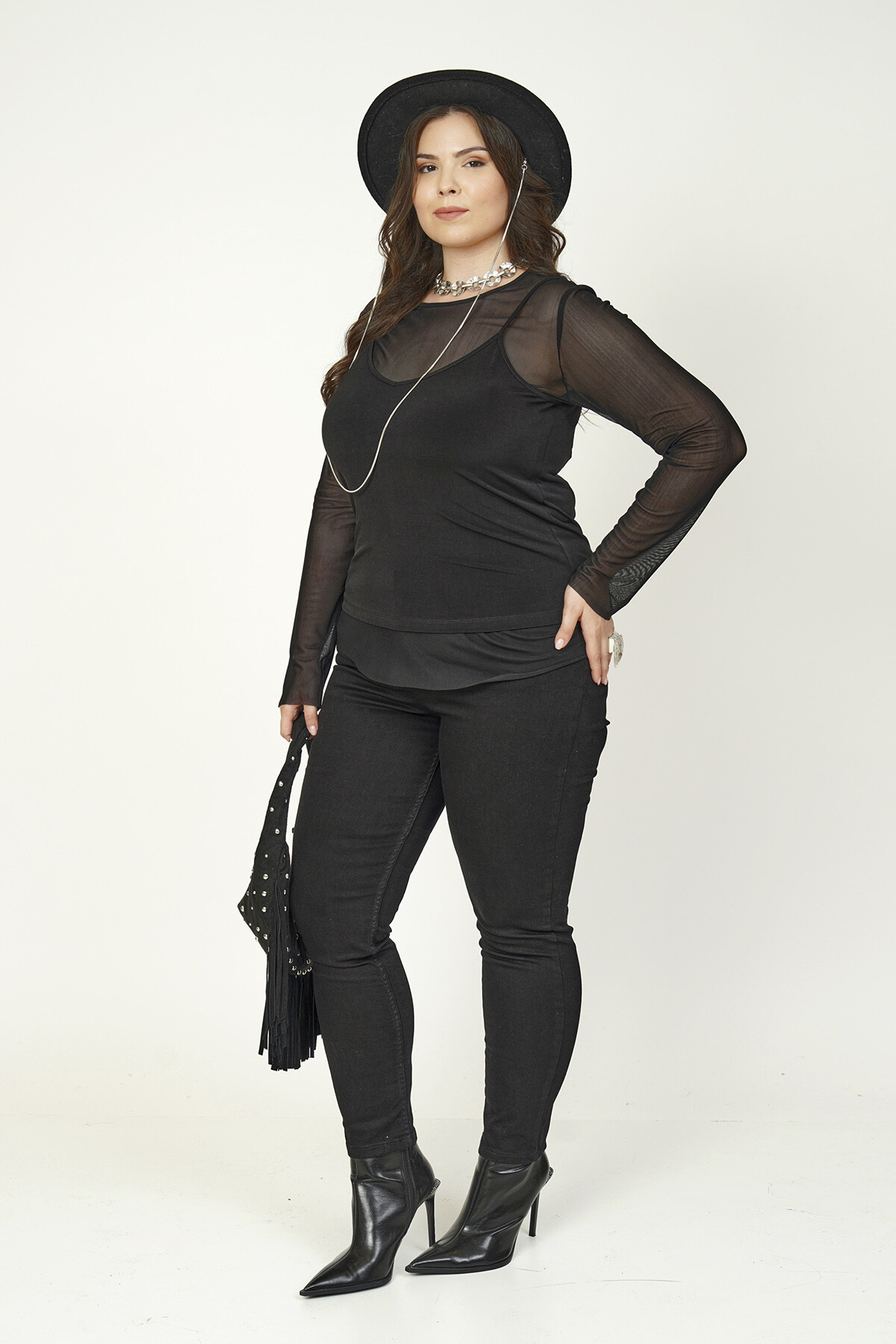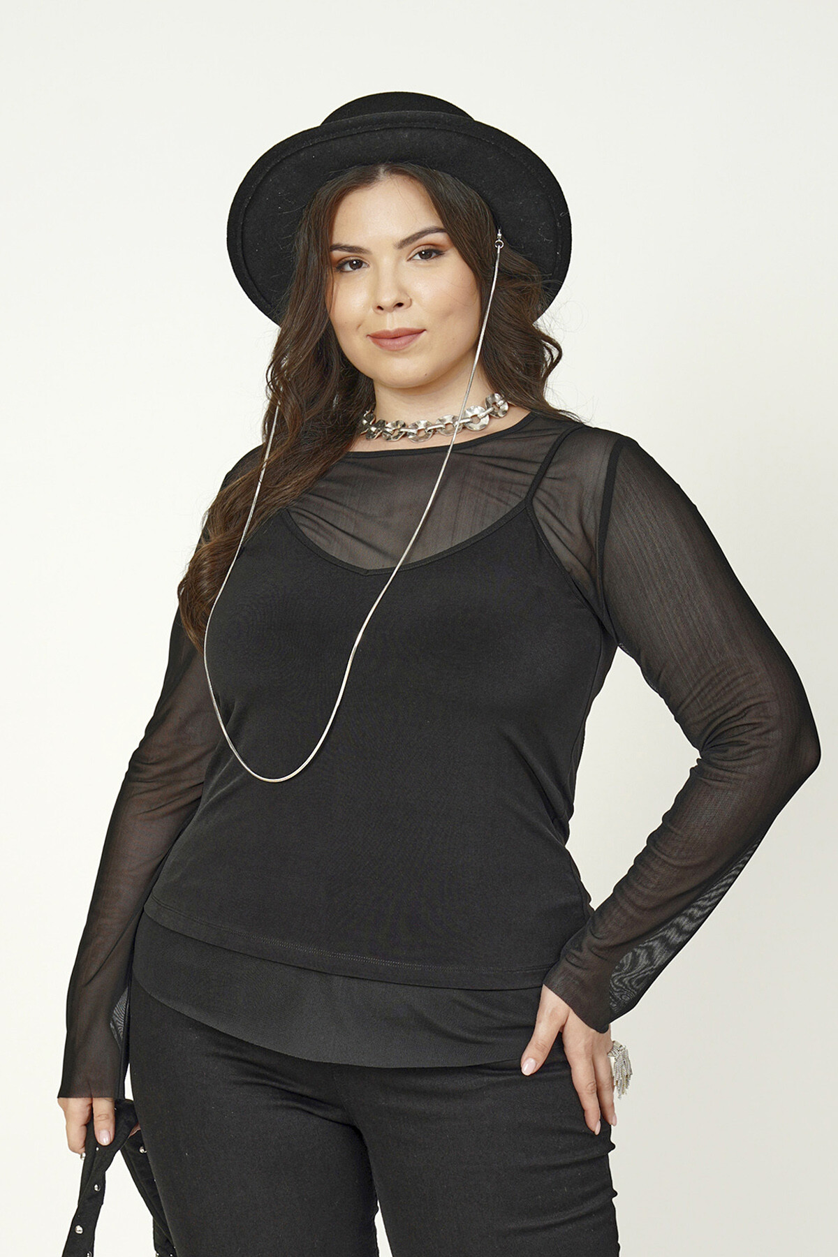 Büyük beden tül detaylı bluz.