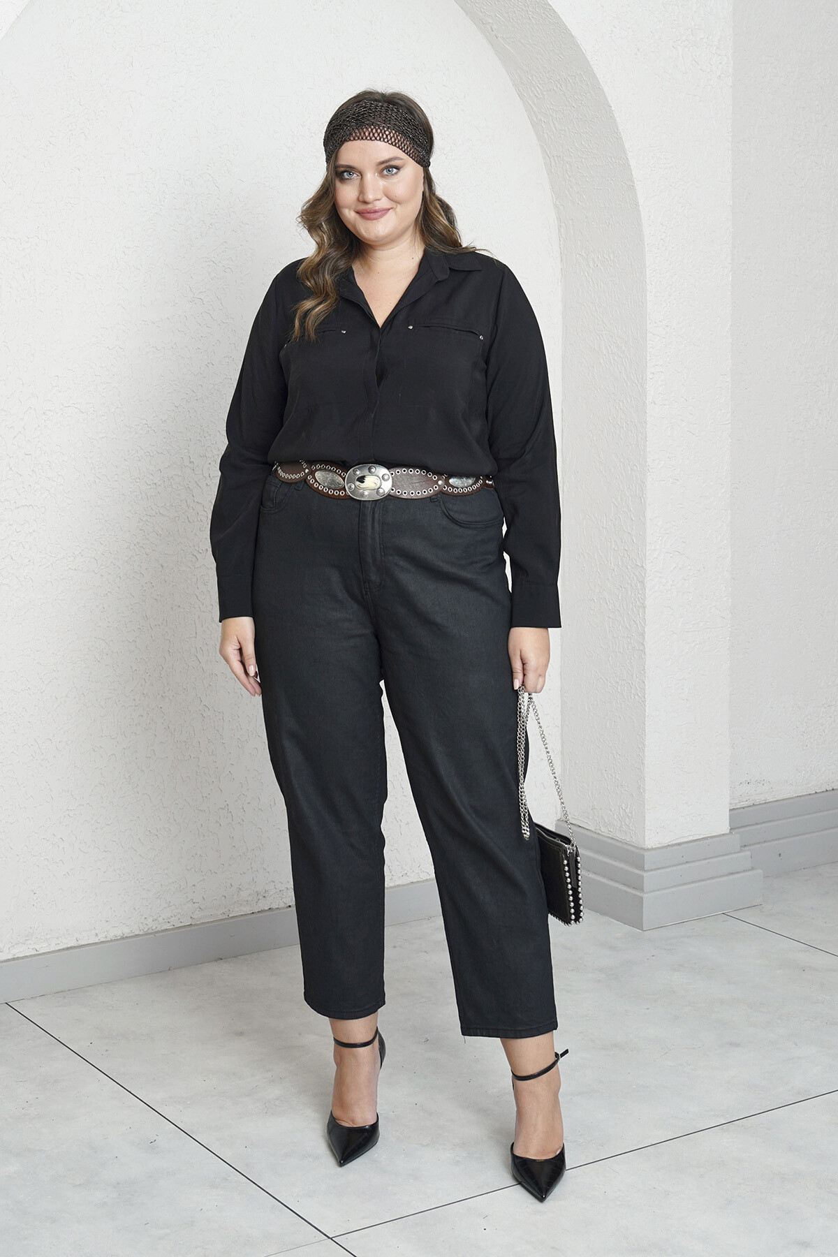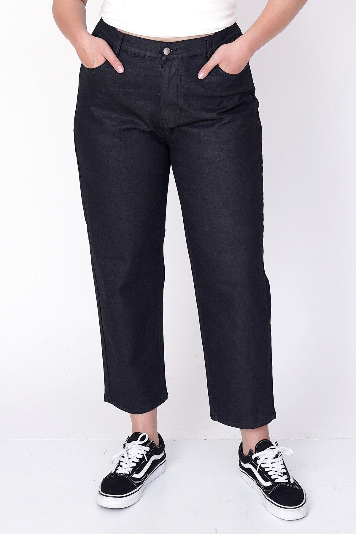 Büyük beden deri görünümlü mom jean.