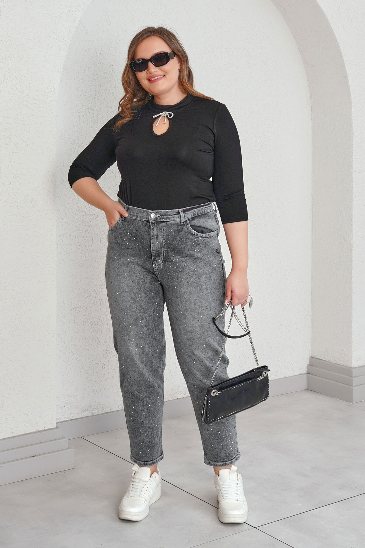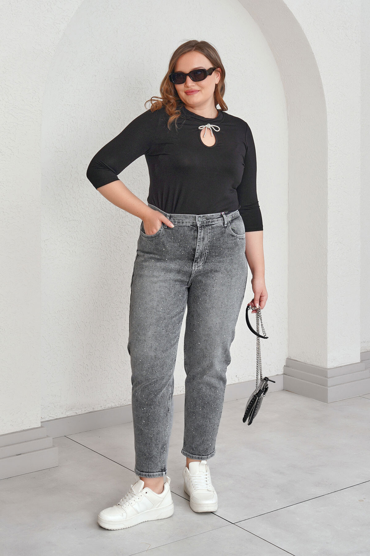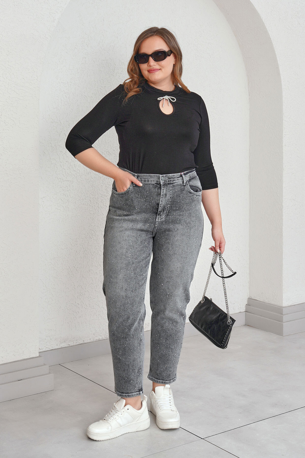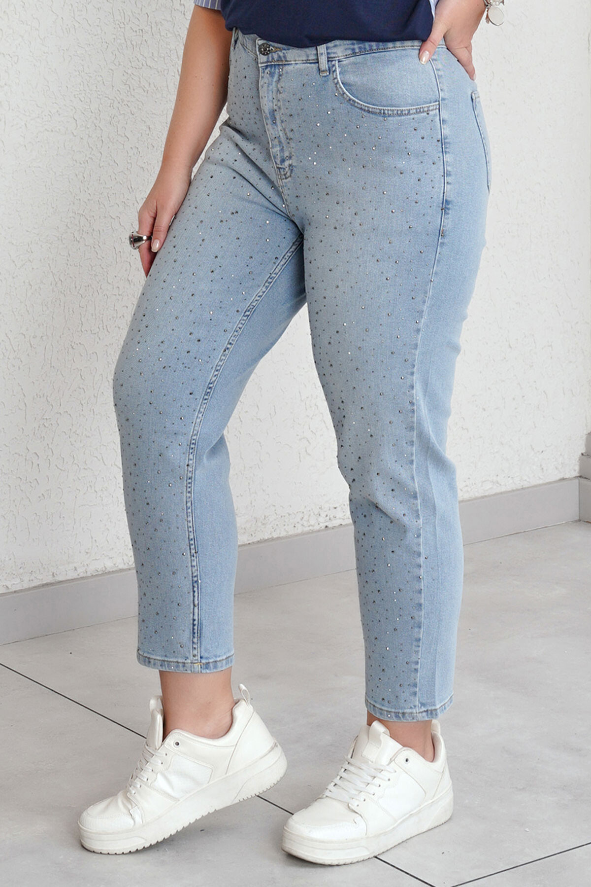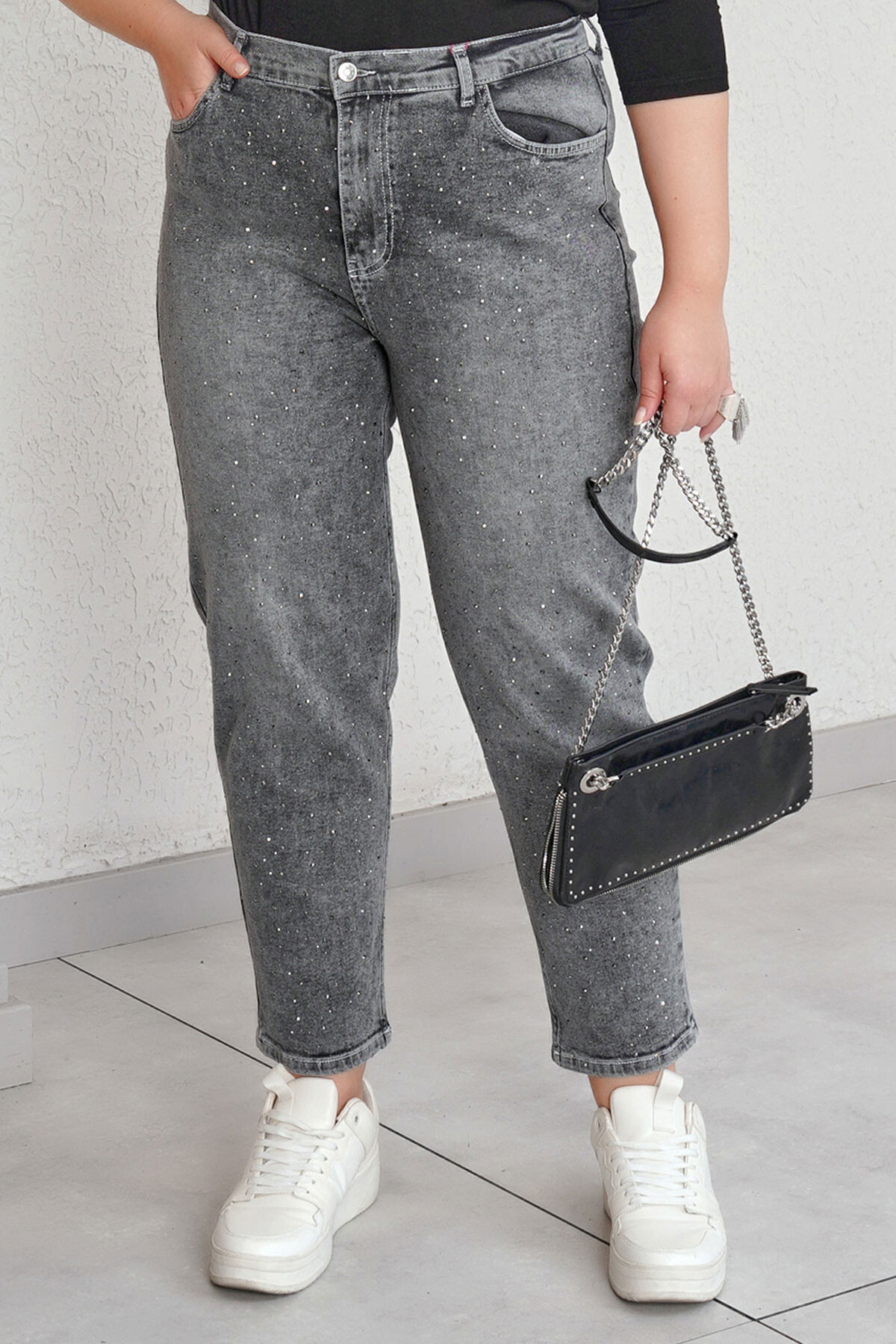 Büyük beden taş baskılı mom jean pantolon.