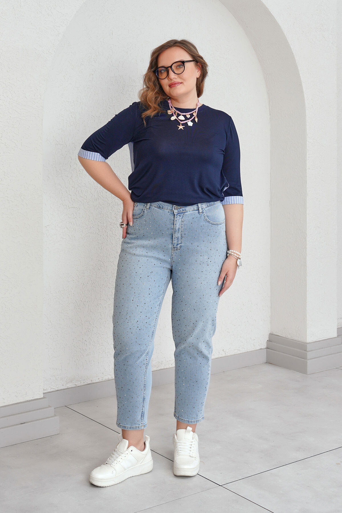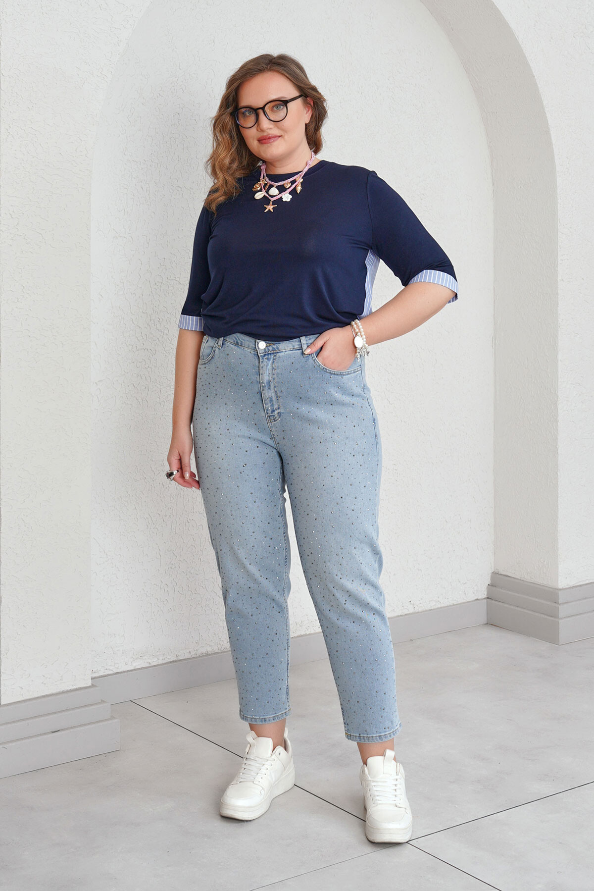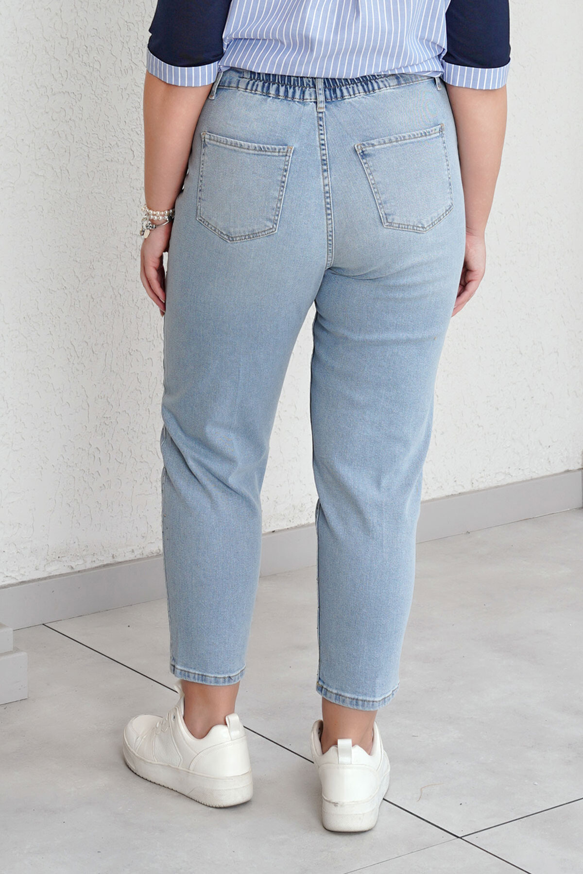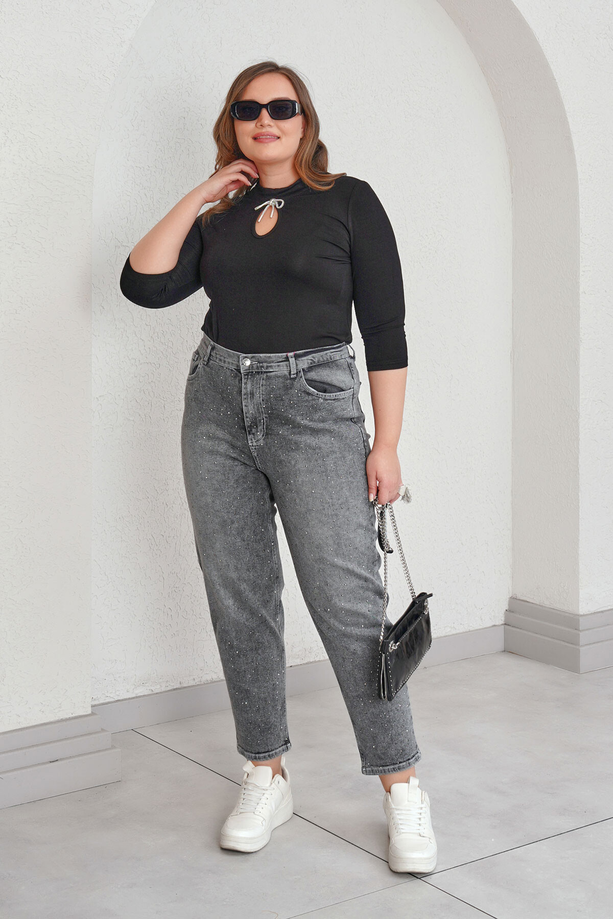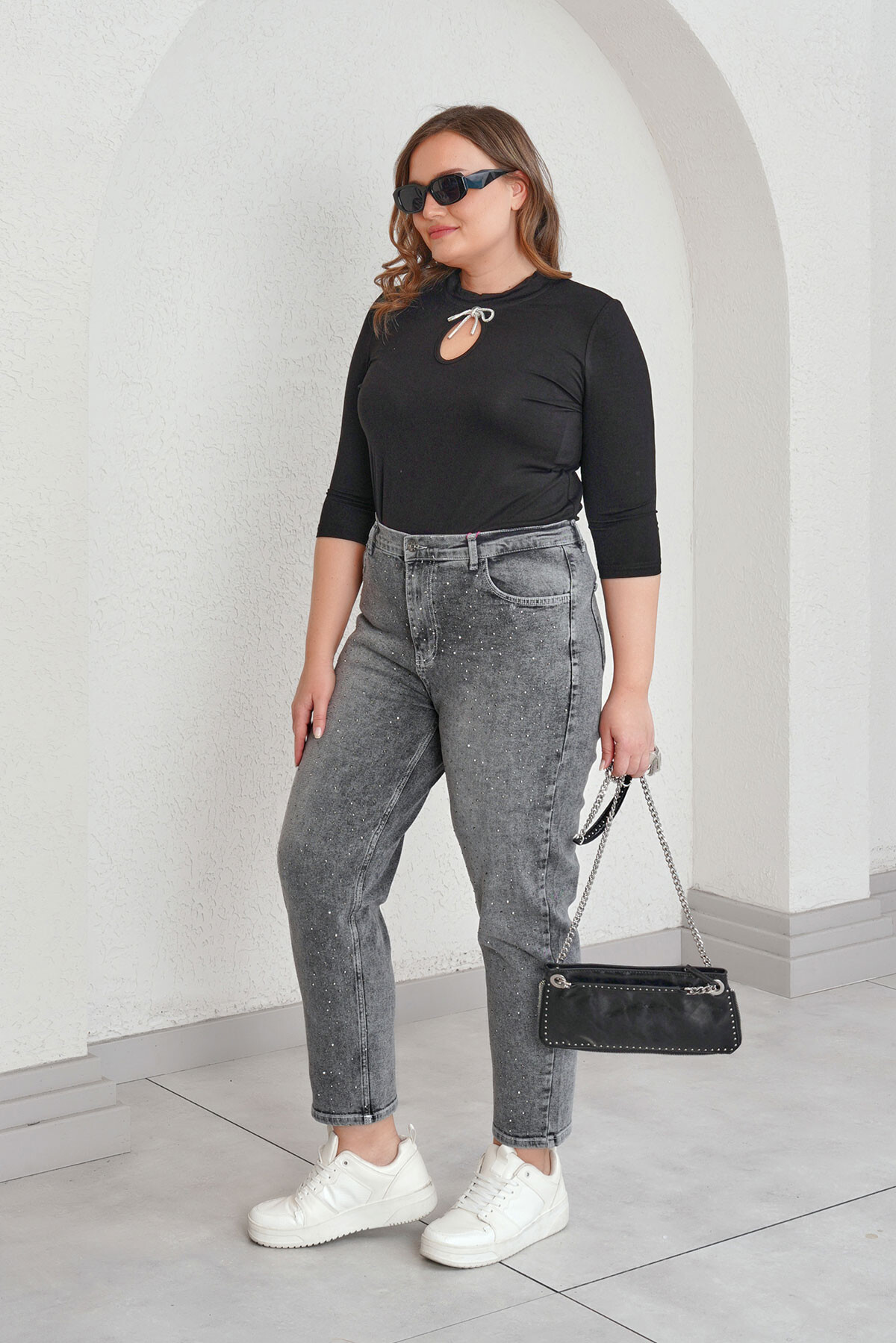 Büyük beden taş baskılı mom jean pantolon.