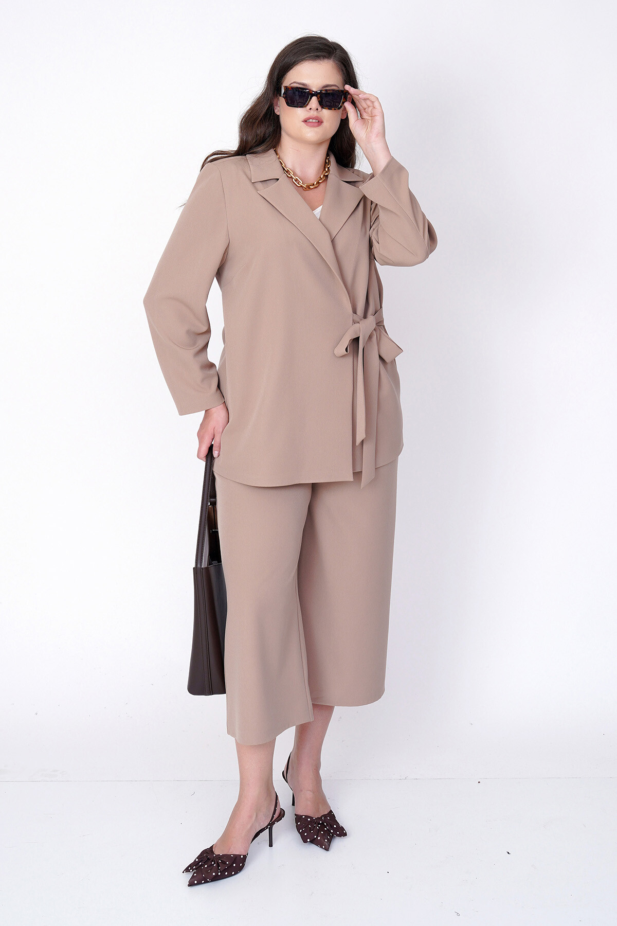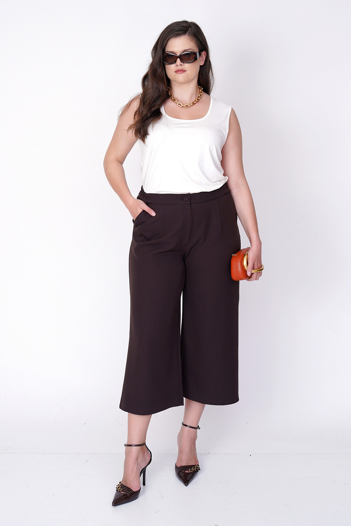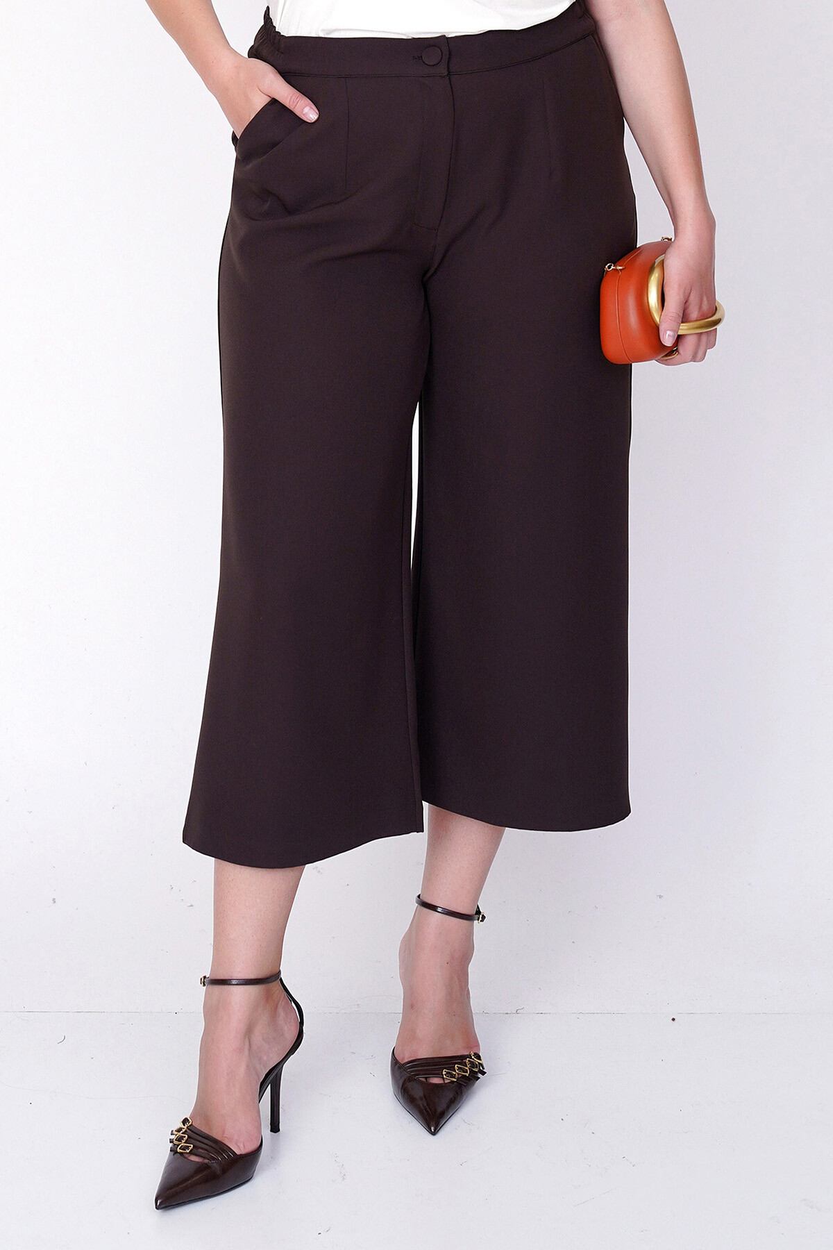 Plus size, wide and cropped leg culotte fabric trousers.