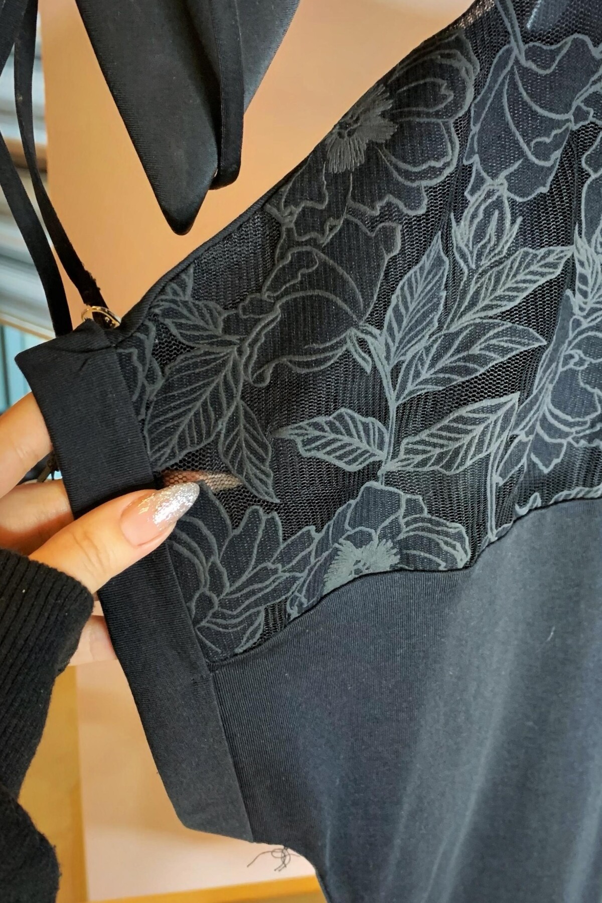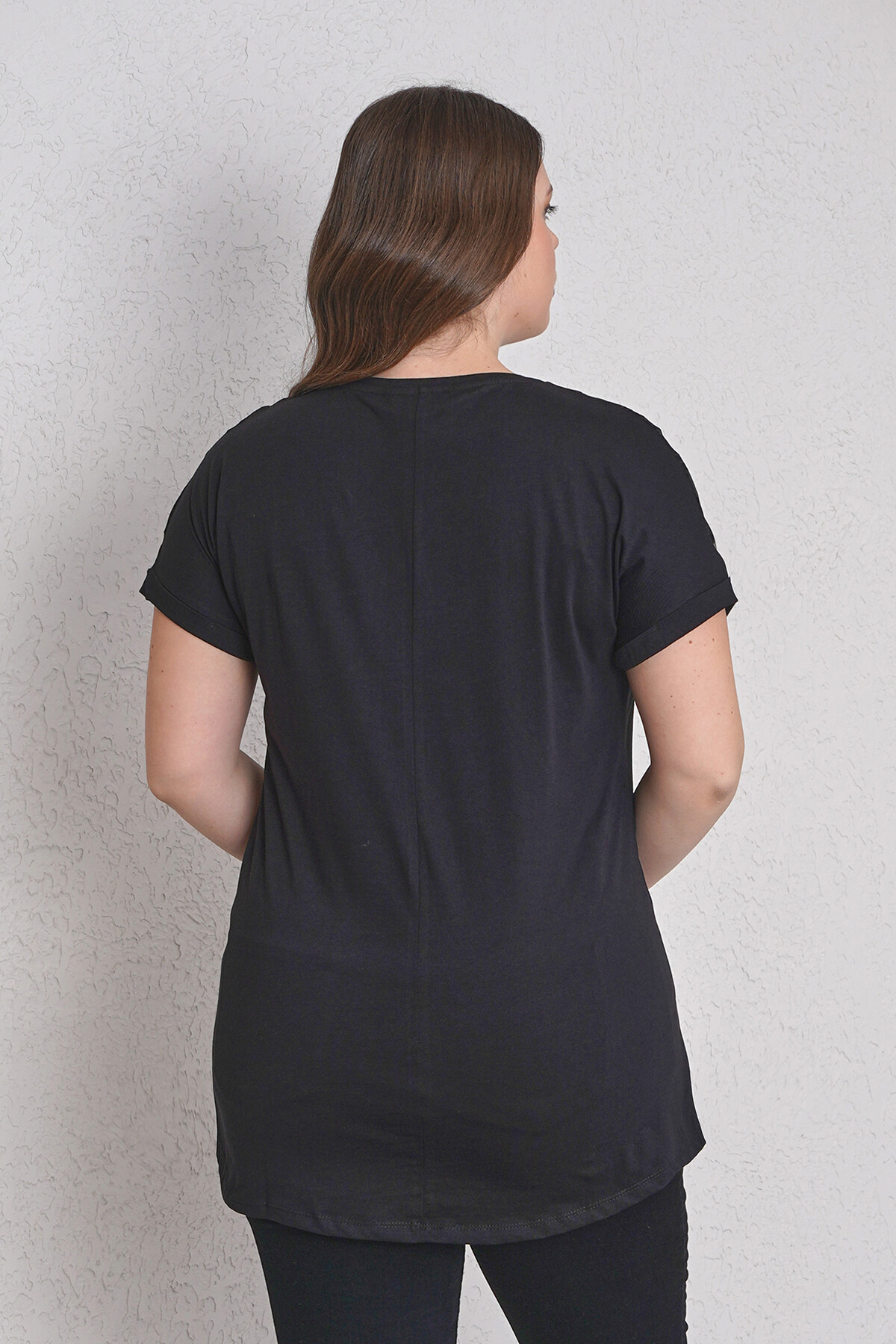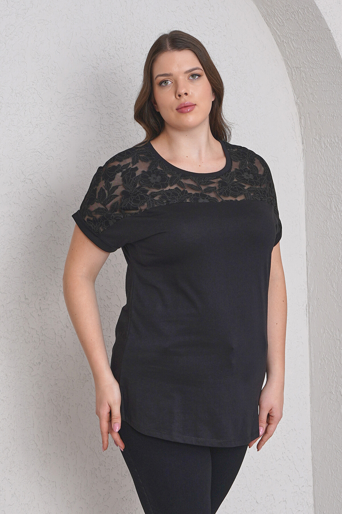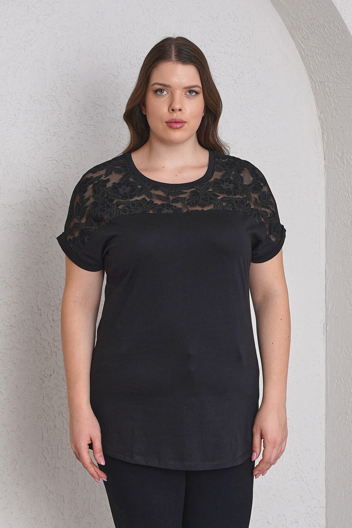 Büyük beden çiçekli tül dantel detaylı tişört.
