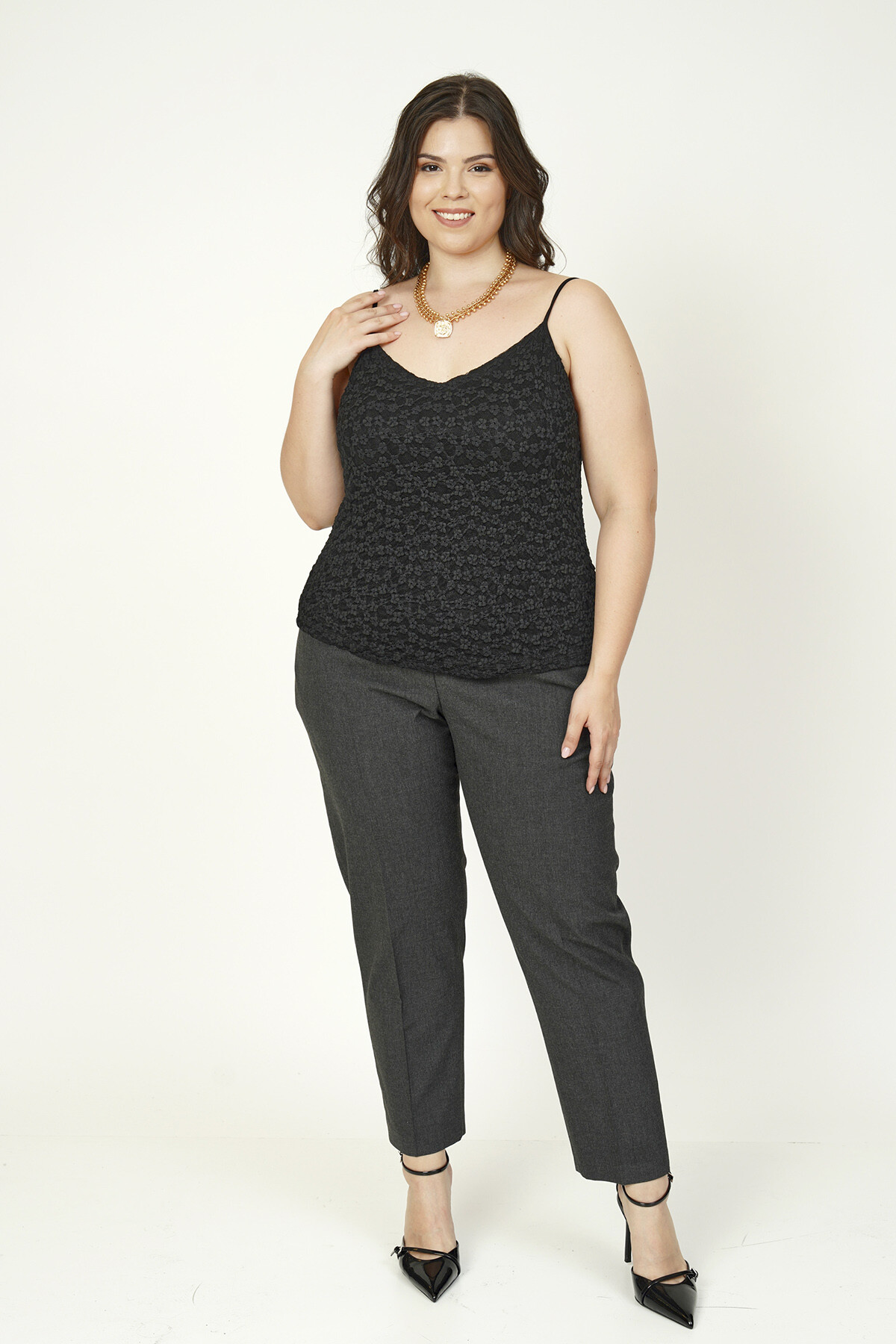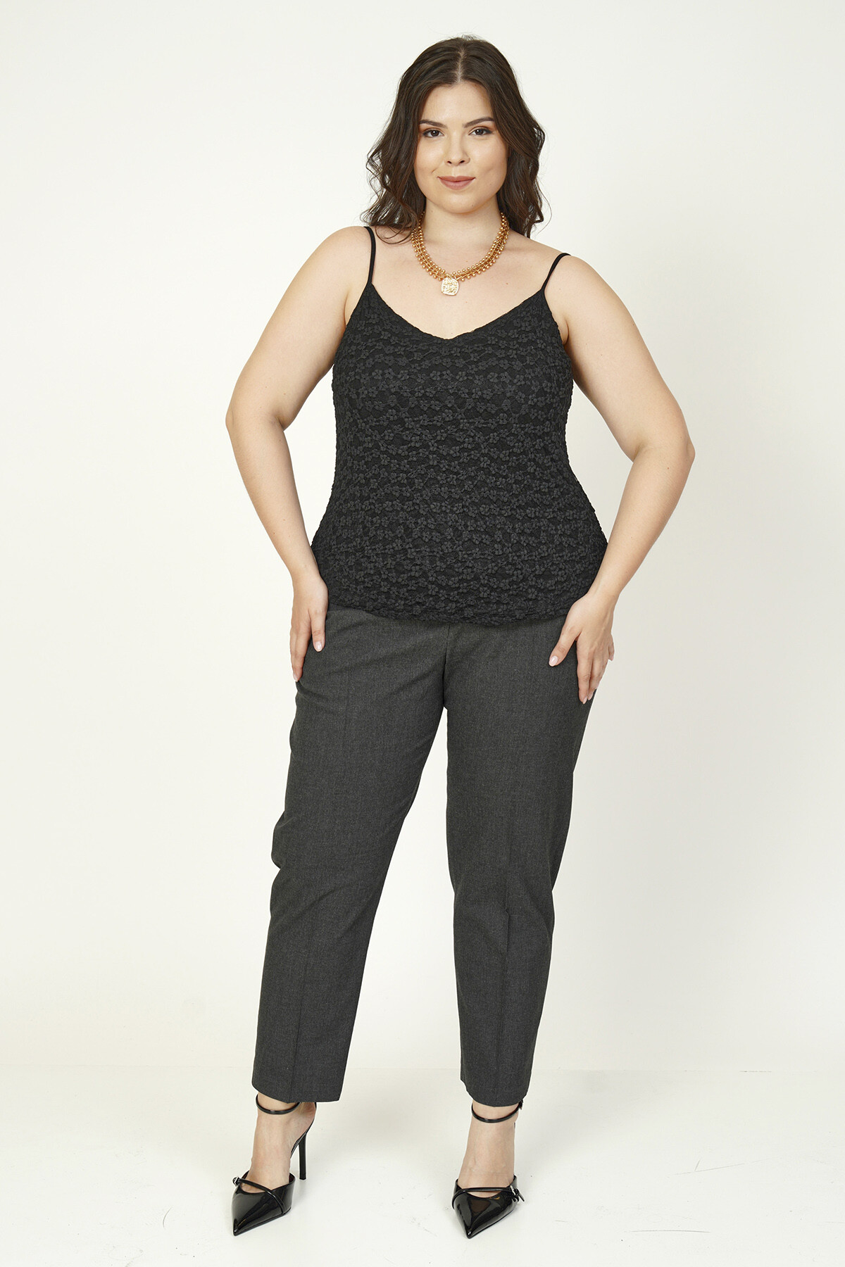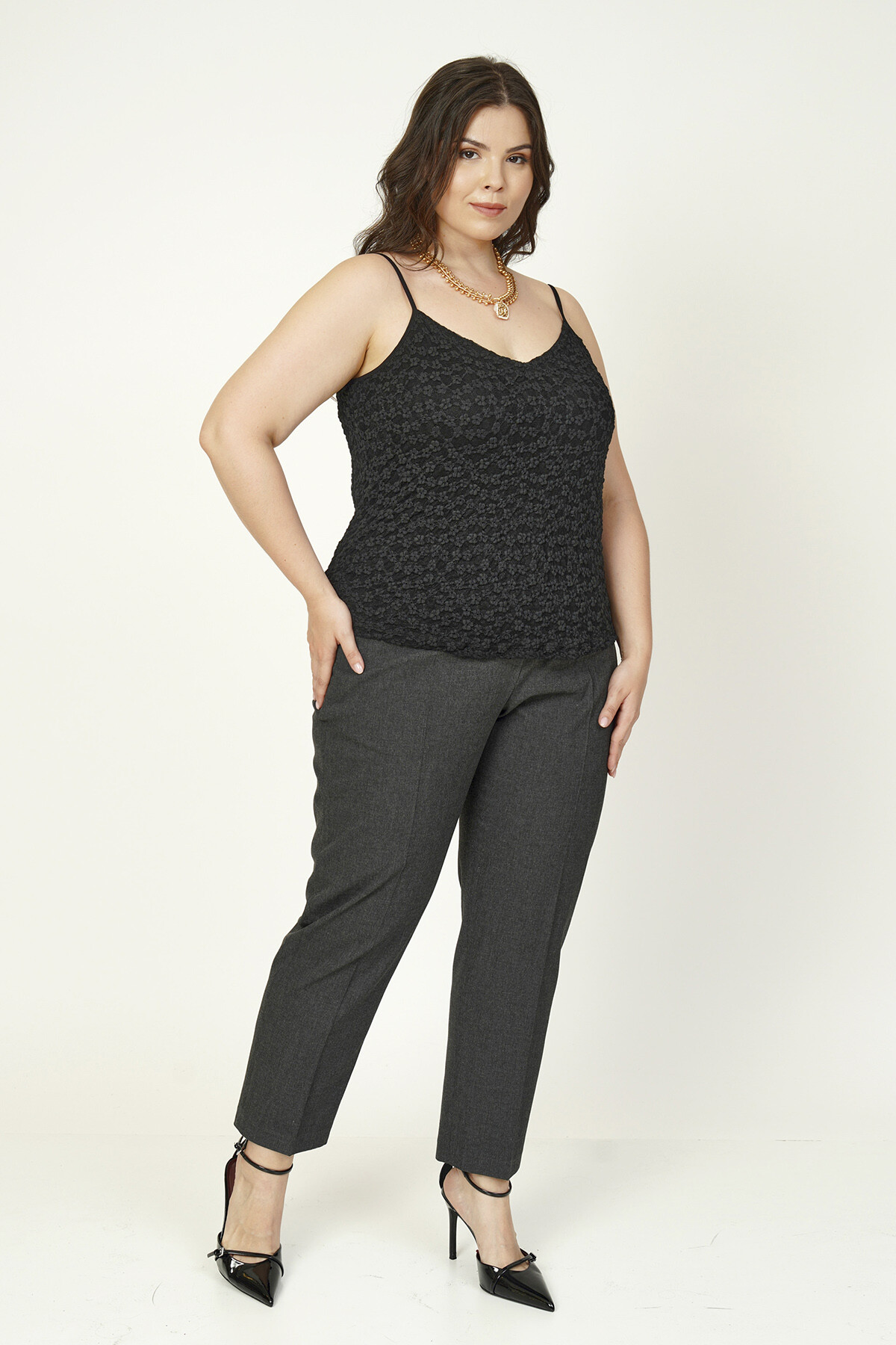 Büyük beden dantel kumaştan, içi astarlı askılı bluz.