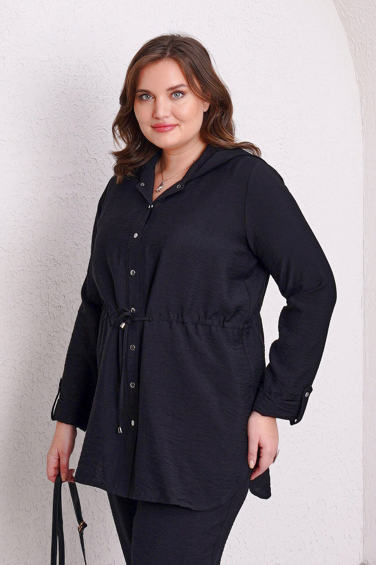 Büyük beden beli ayarlanabilir lastikli ve bağcıklı, çıtçıt kapamalı kapüşonlu ceket.