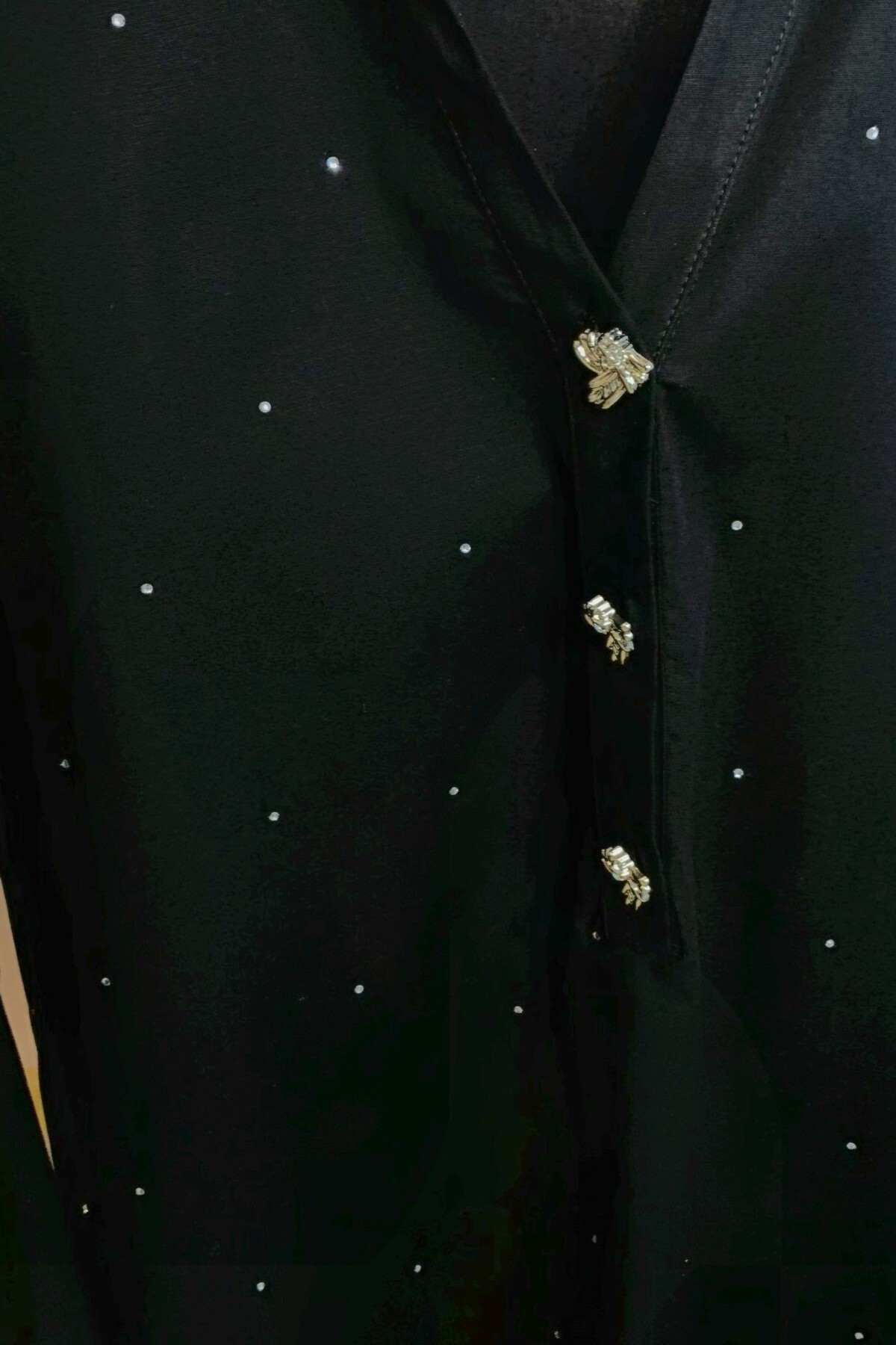 Featuring thick cuffs, collared neckline, and side vents with rhinestone print detail.