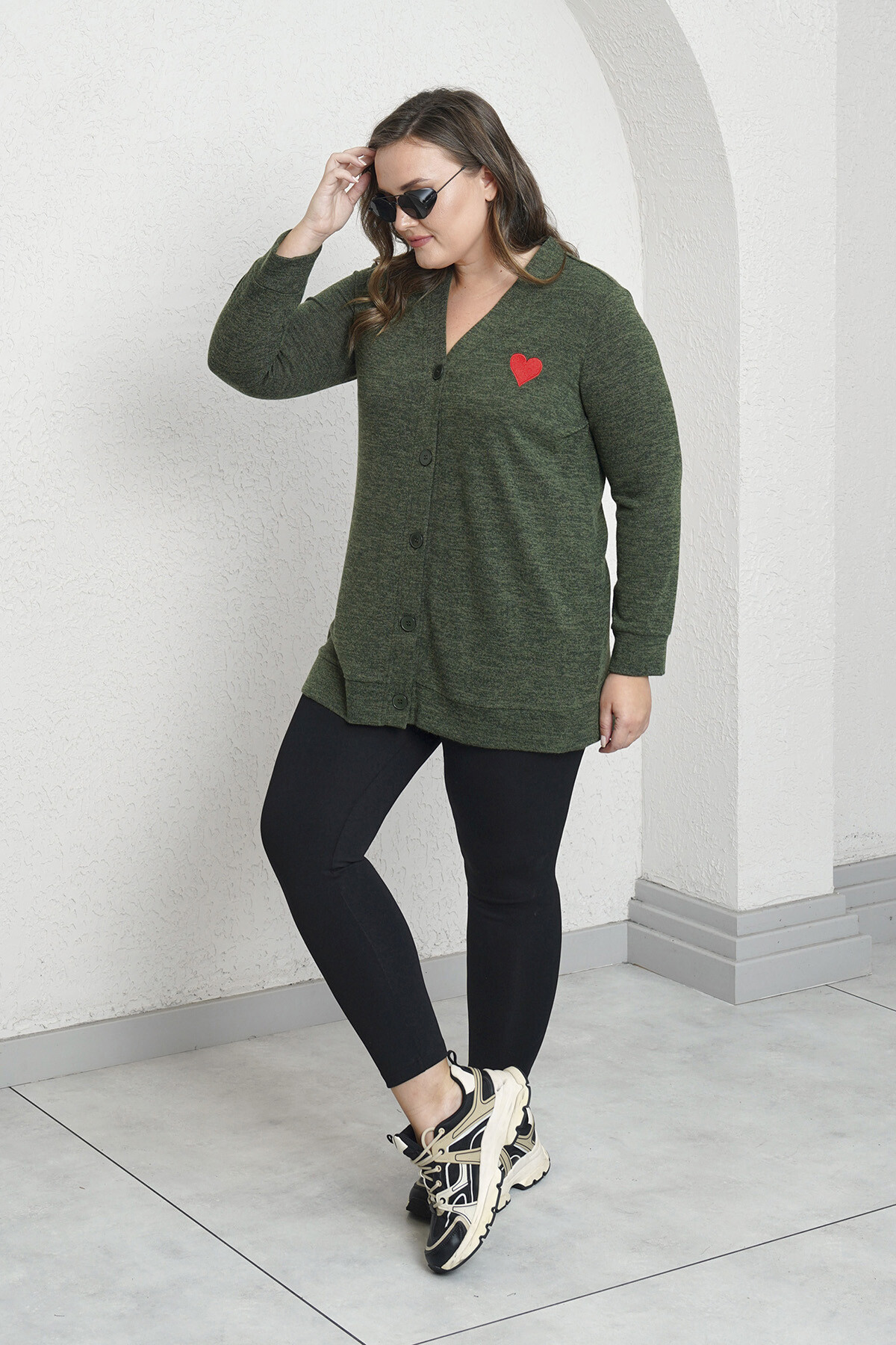 Plus size knit cardigan with heart embroidery, V-neck and long sleeves.