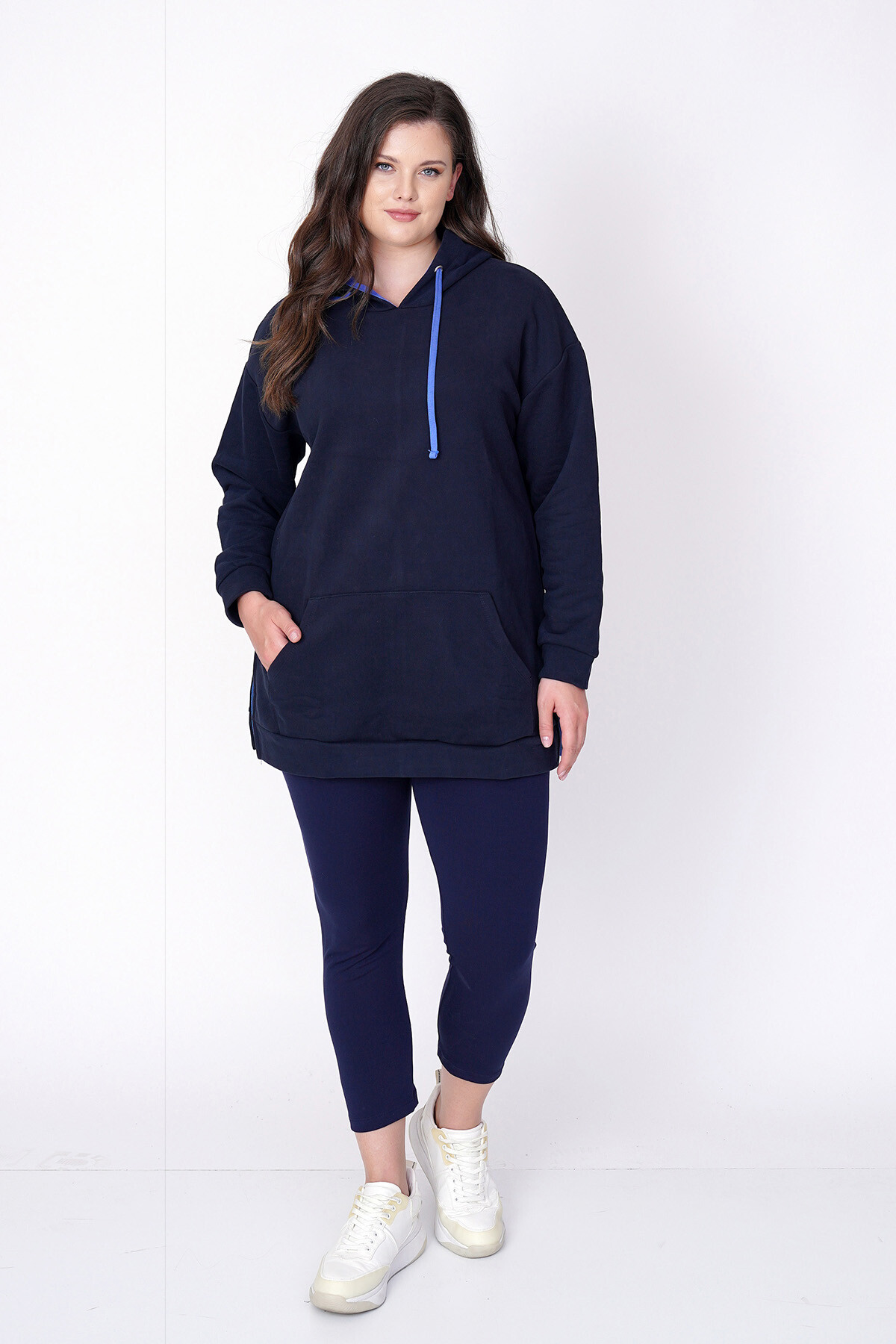 Büyük beden kapüşonlu, uzun kollu, yanları yırtmaçlı sweatshirt.
