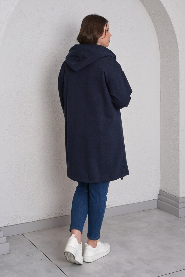 Büyük beden pamuk karışımlı kumaştan üretilen, önü açık, uzun, yazı baskılı ve kapüşonlu hırka.