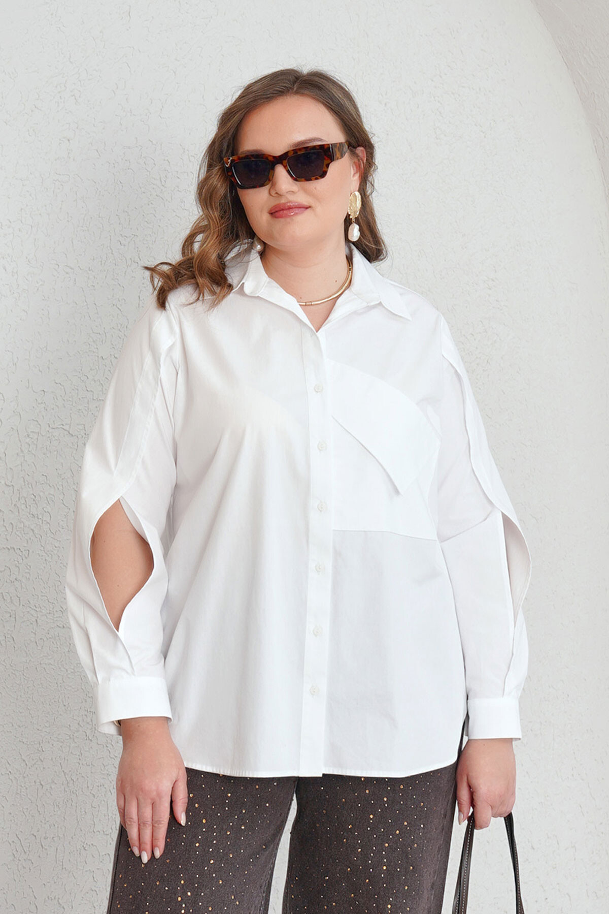 Büyük beden %100 Pamuk kumaştan, cep ve kol pencere detaylı gömlek.