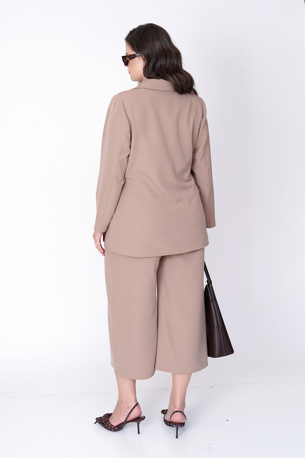 Büyük beden likralı ceket kumaşından, kuşaklı blazer ceket.