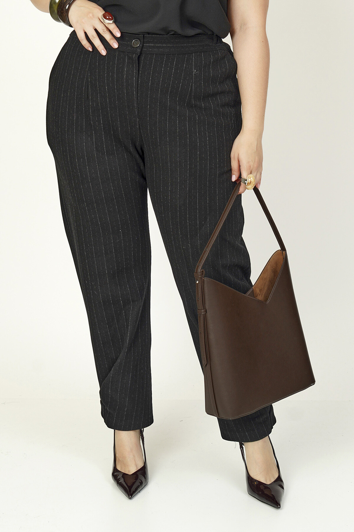Plus size high-waist pinstripe trousers.