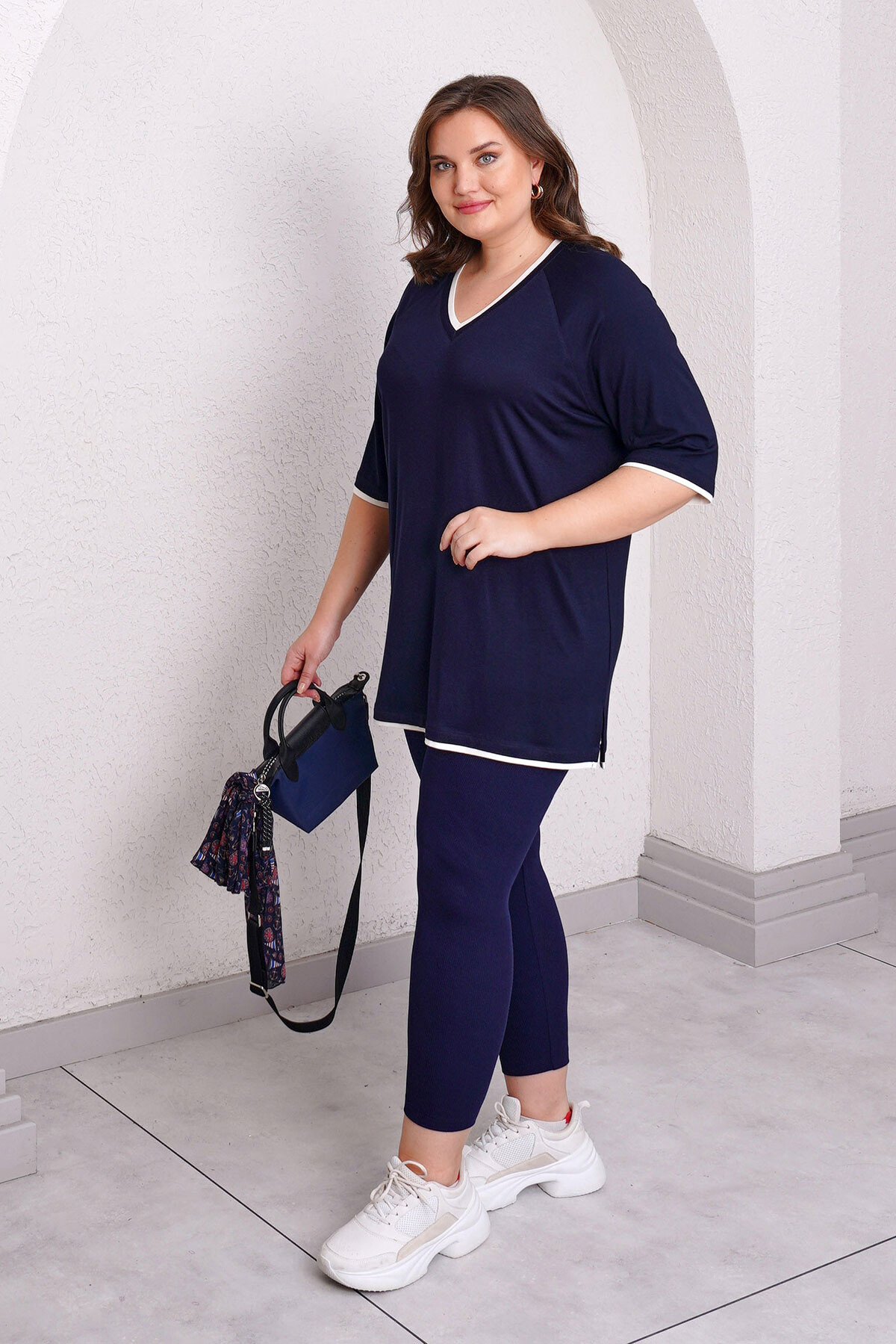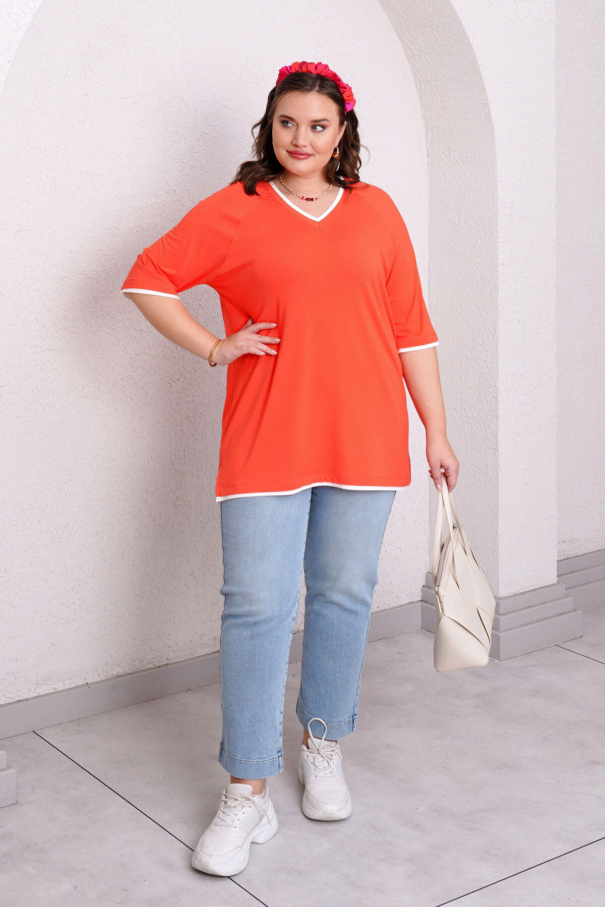 Plus size V-neck T-shirt with elbow-length sleeves and side slits.