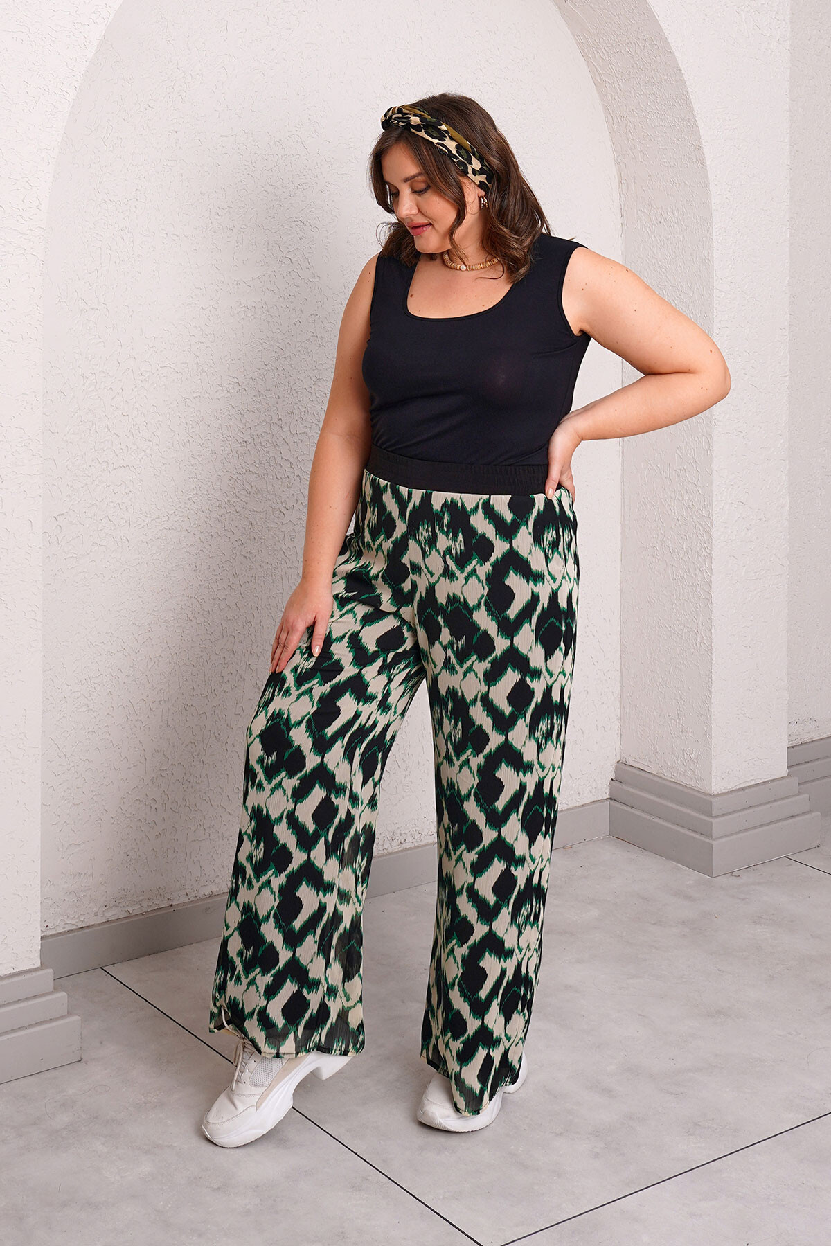 Plus size elastic waistband printed chiffon trousers.