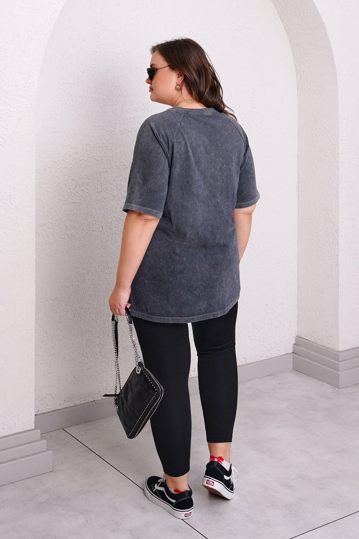 Plus size stone washed t-shirt with a round neck and short sleeves at the elbow.