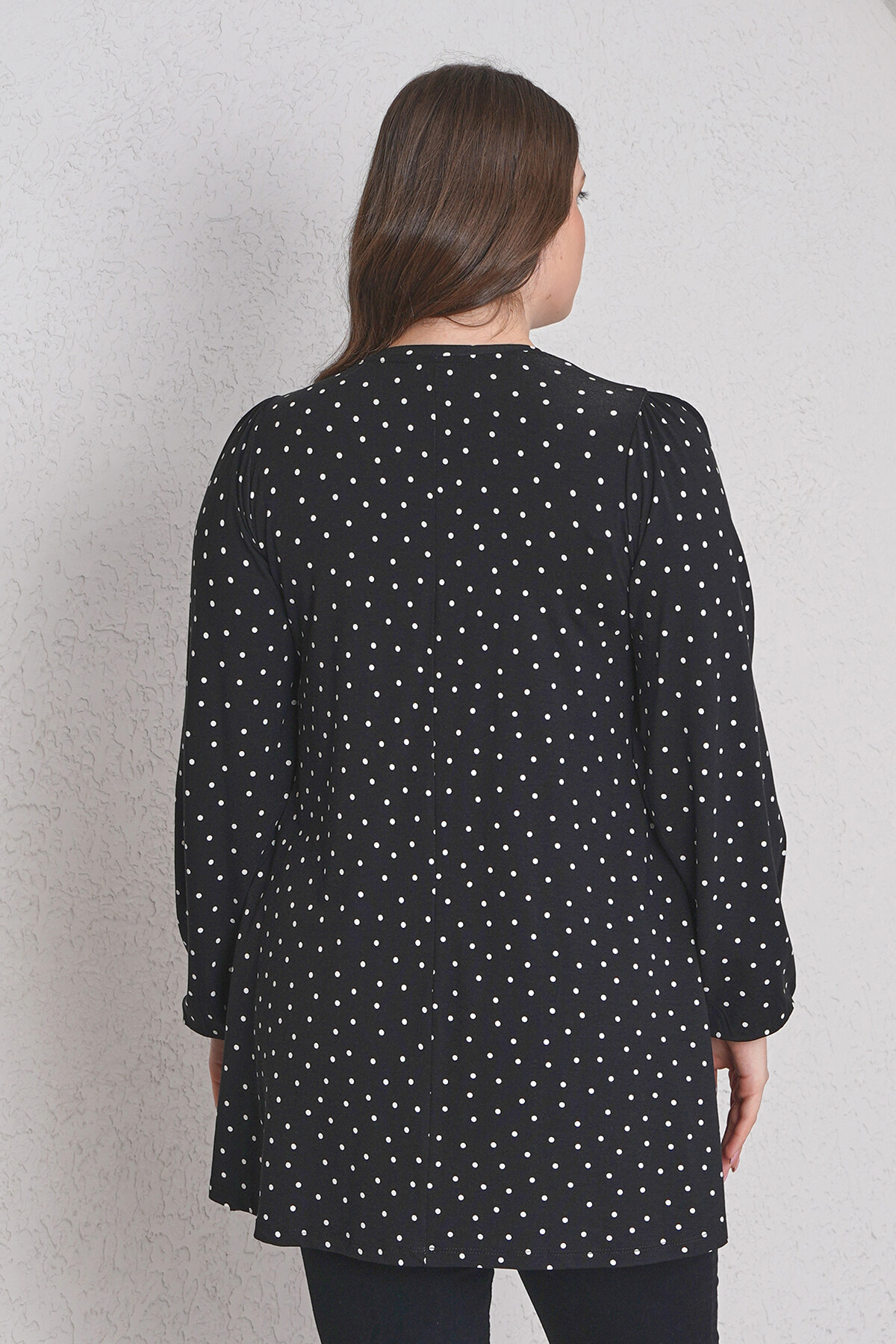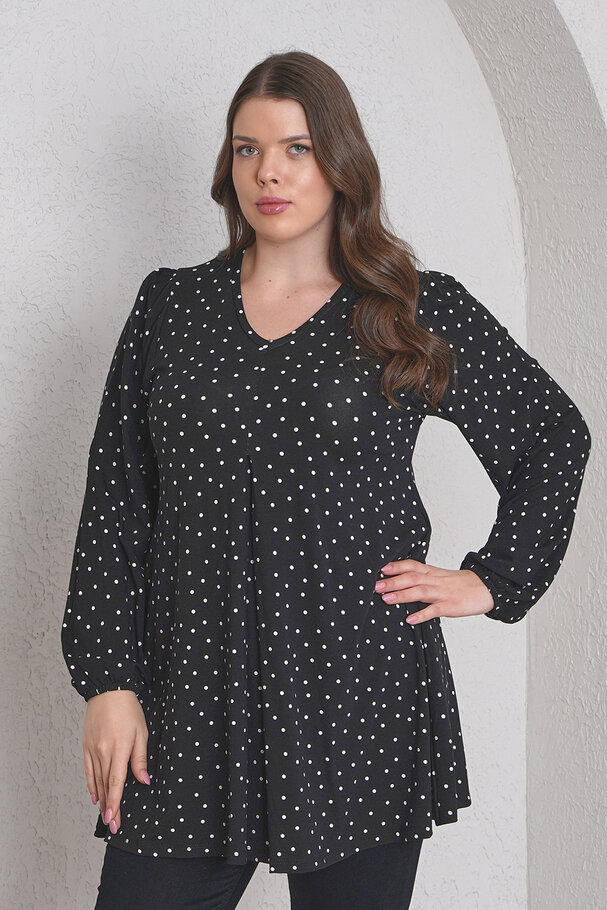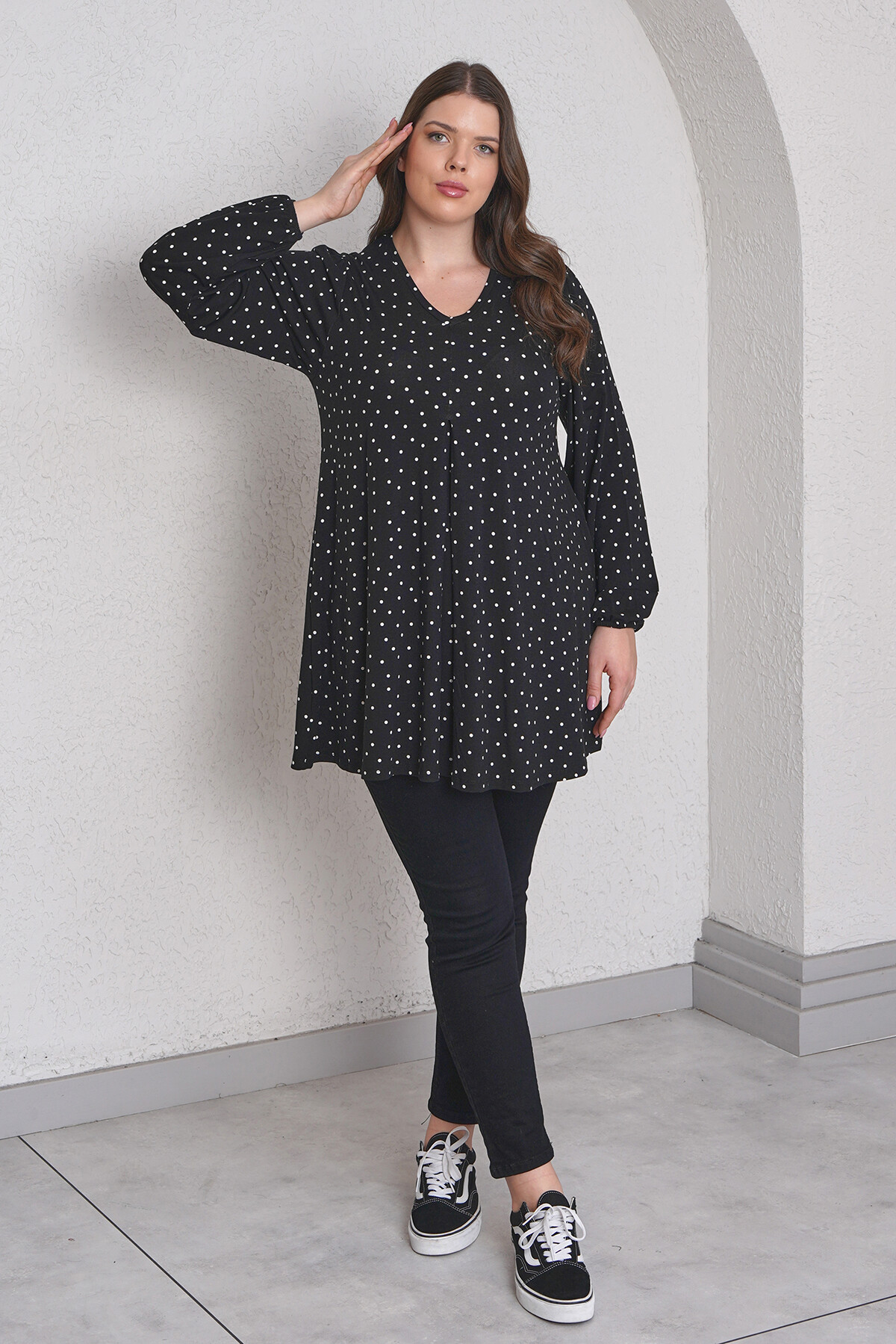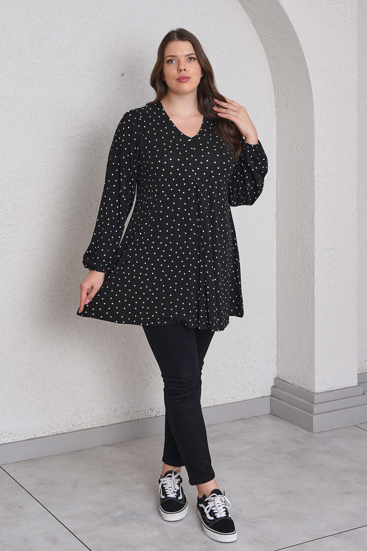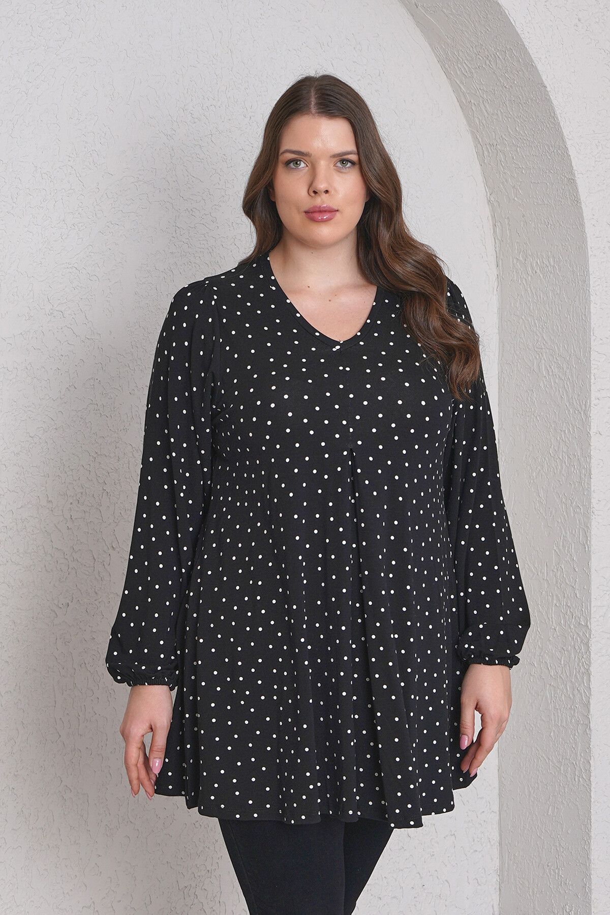 Büyük beden V-yaka, puantiye desenli, çan kalıp, pileli uzun kollu bluz.