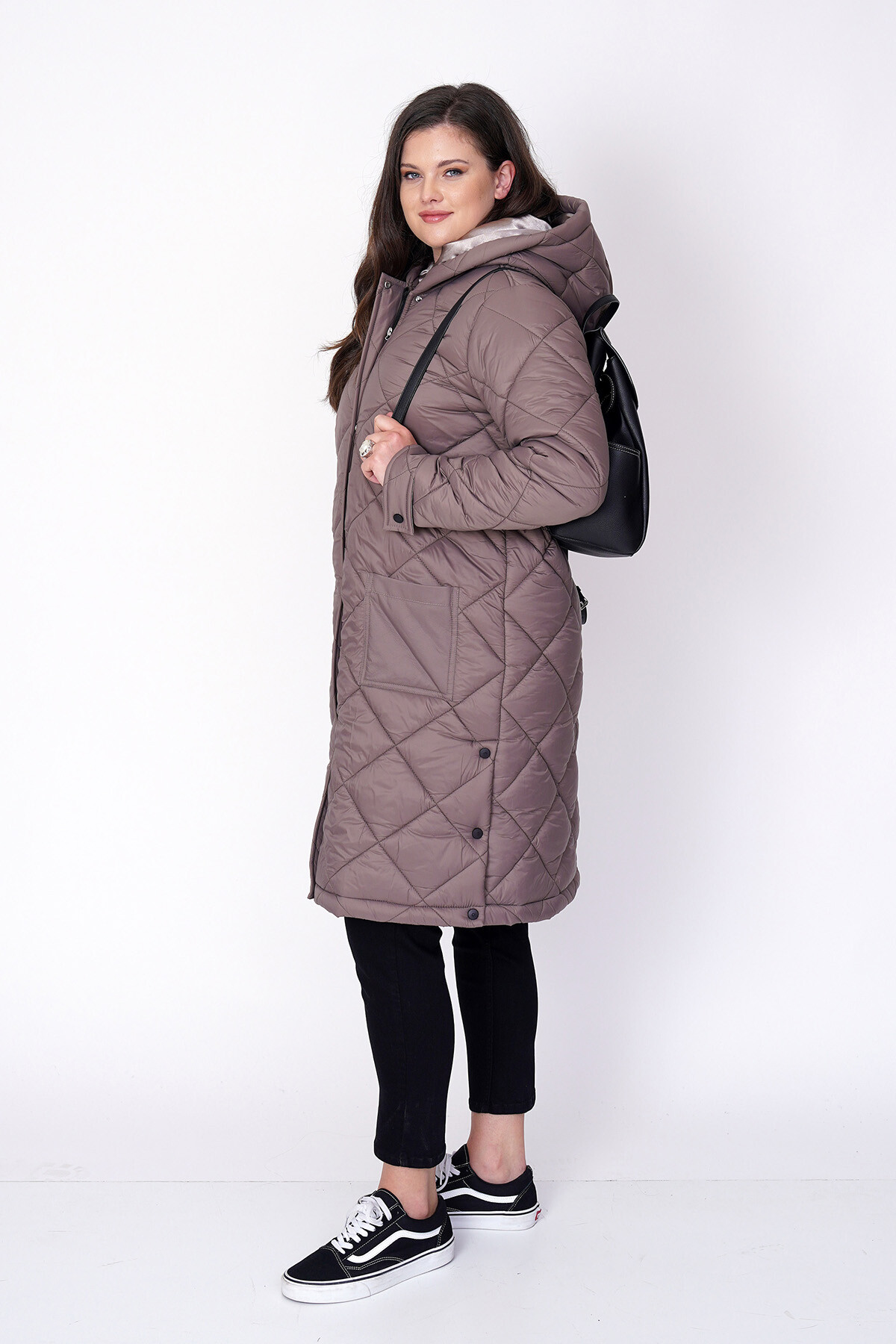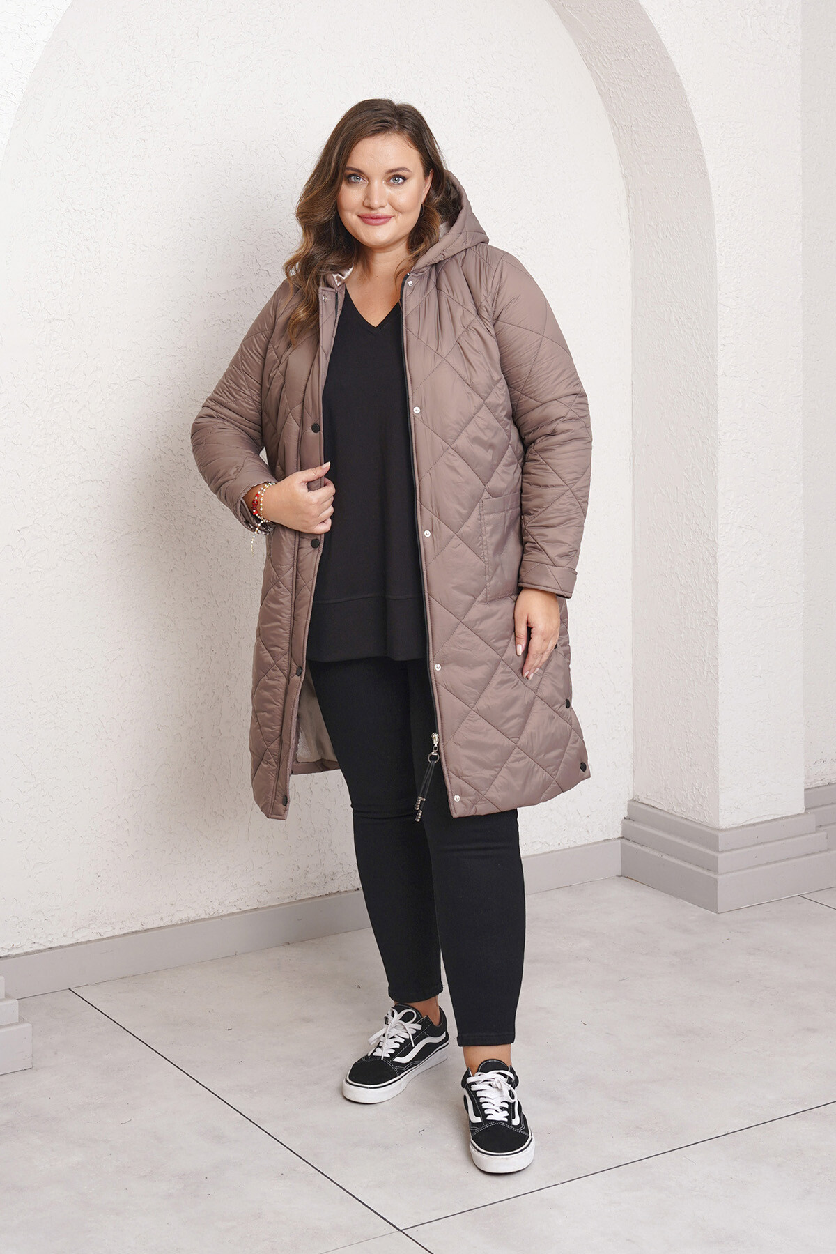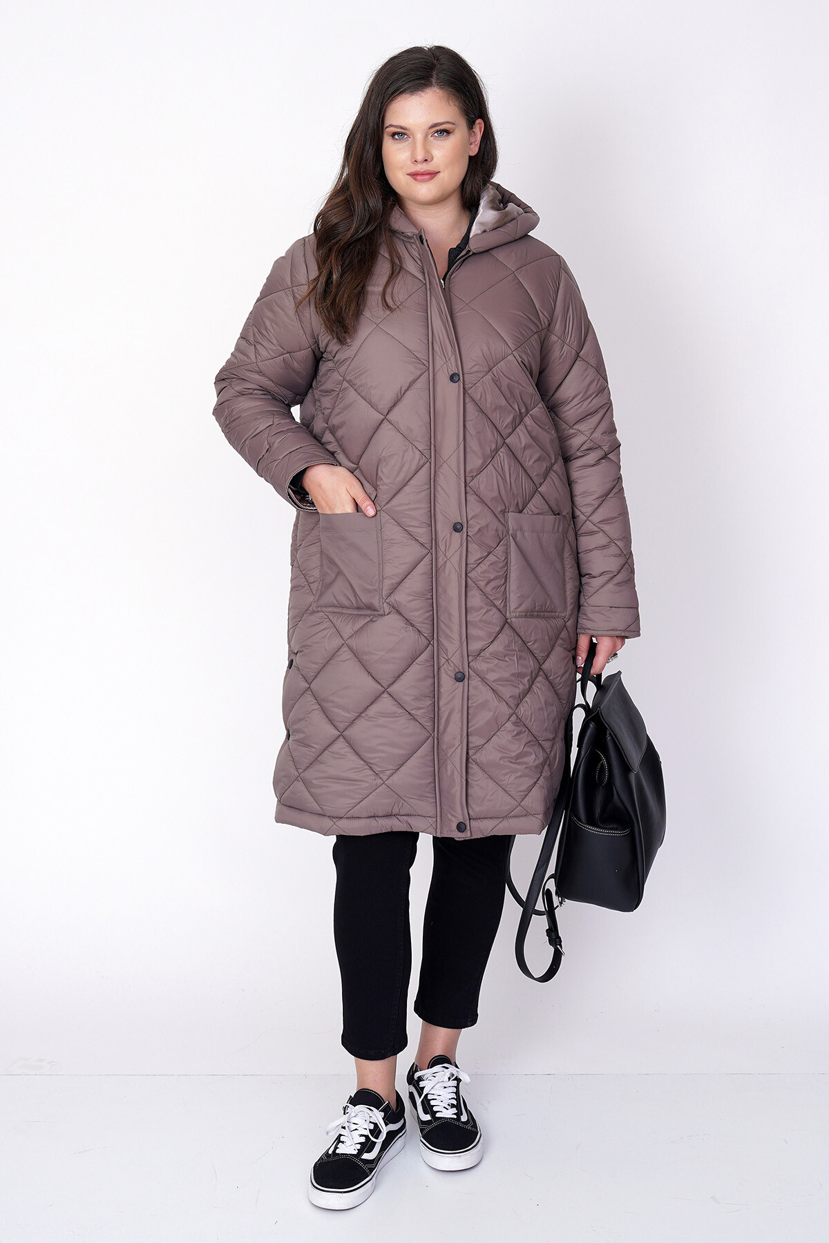 Plus size long puffer coat with long sleeves, stand-up collar, zip and snap button closure.