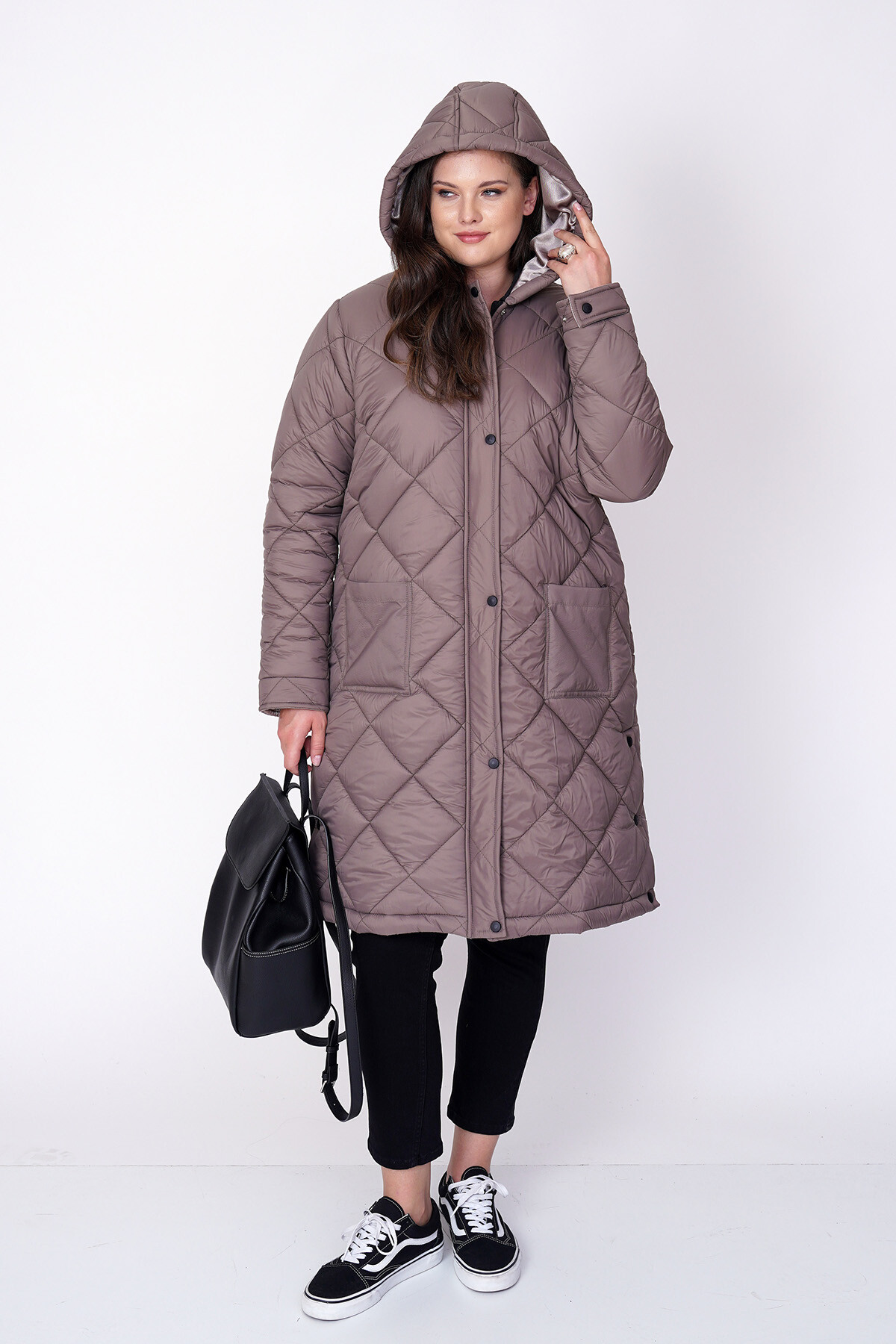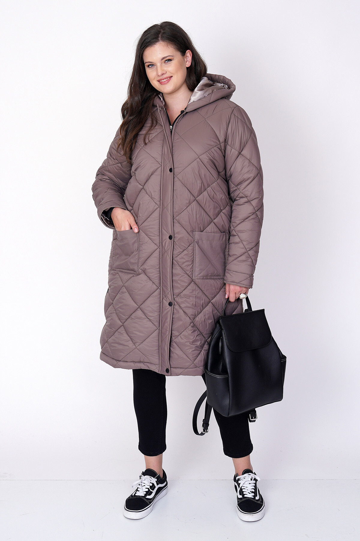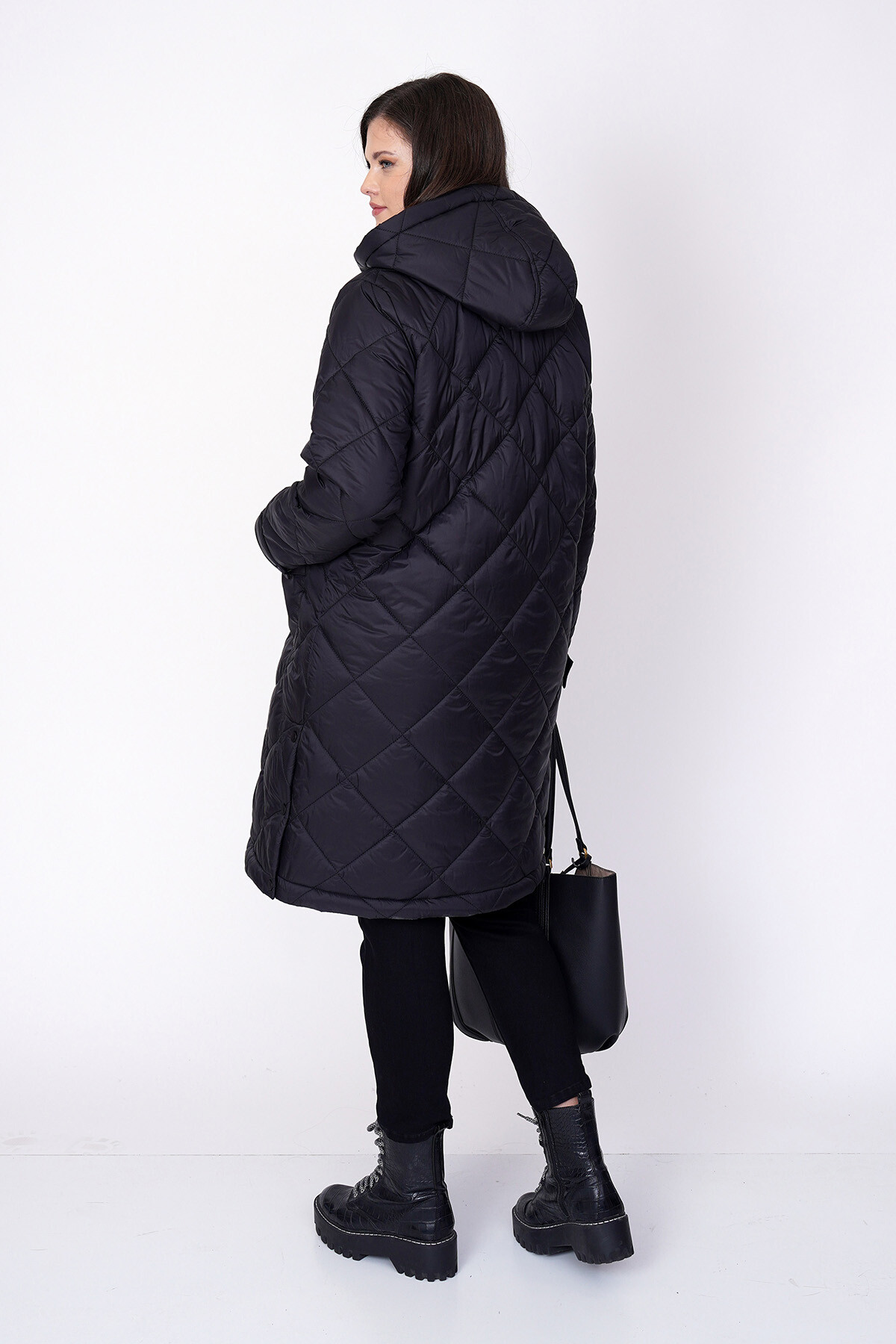 Plus size long puffer coat with long sleeves, stand-up collar, zip and snap button closure.