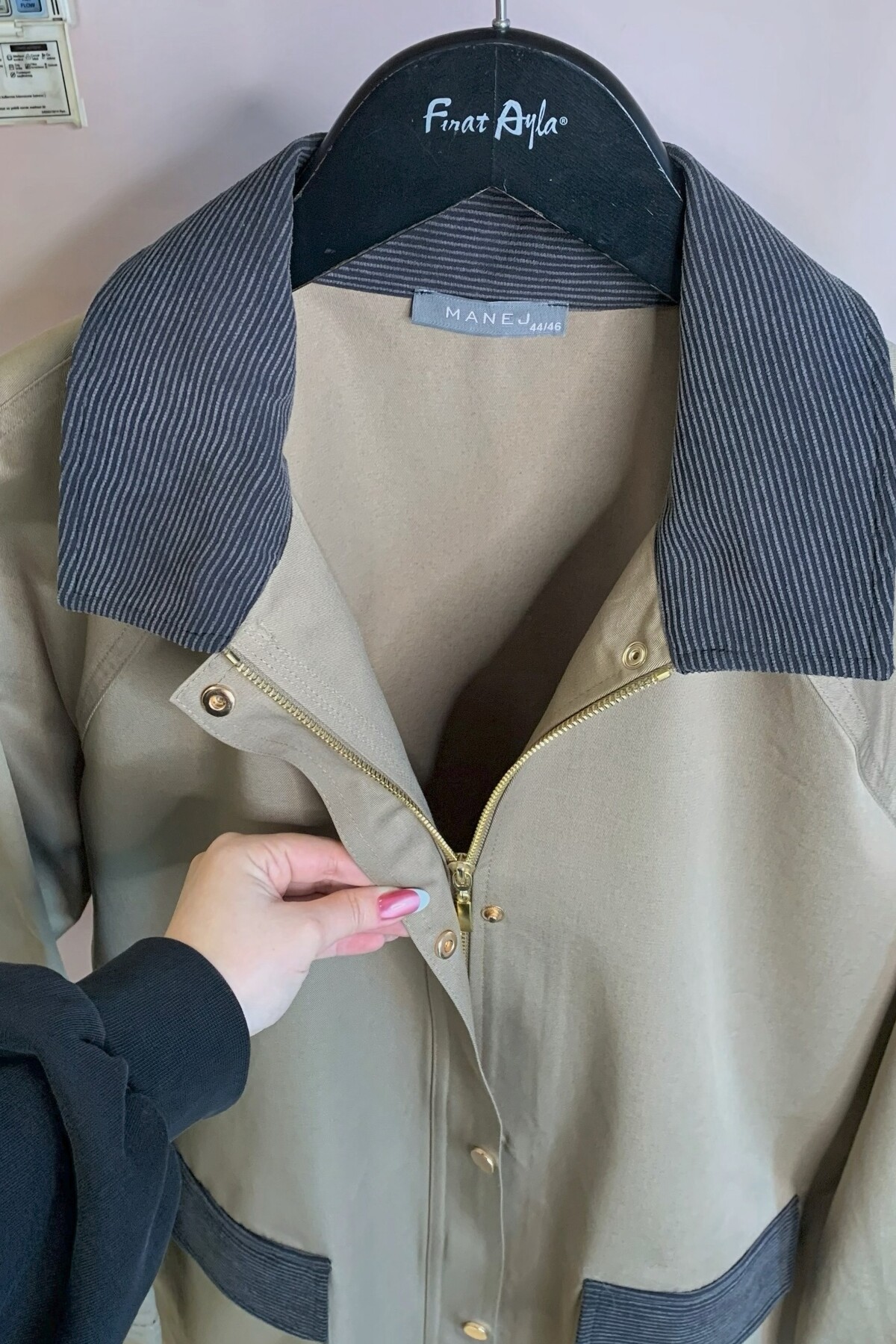 Front zip and gold snap button closure.