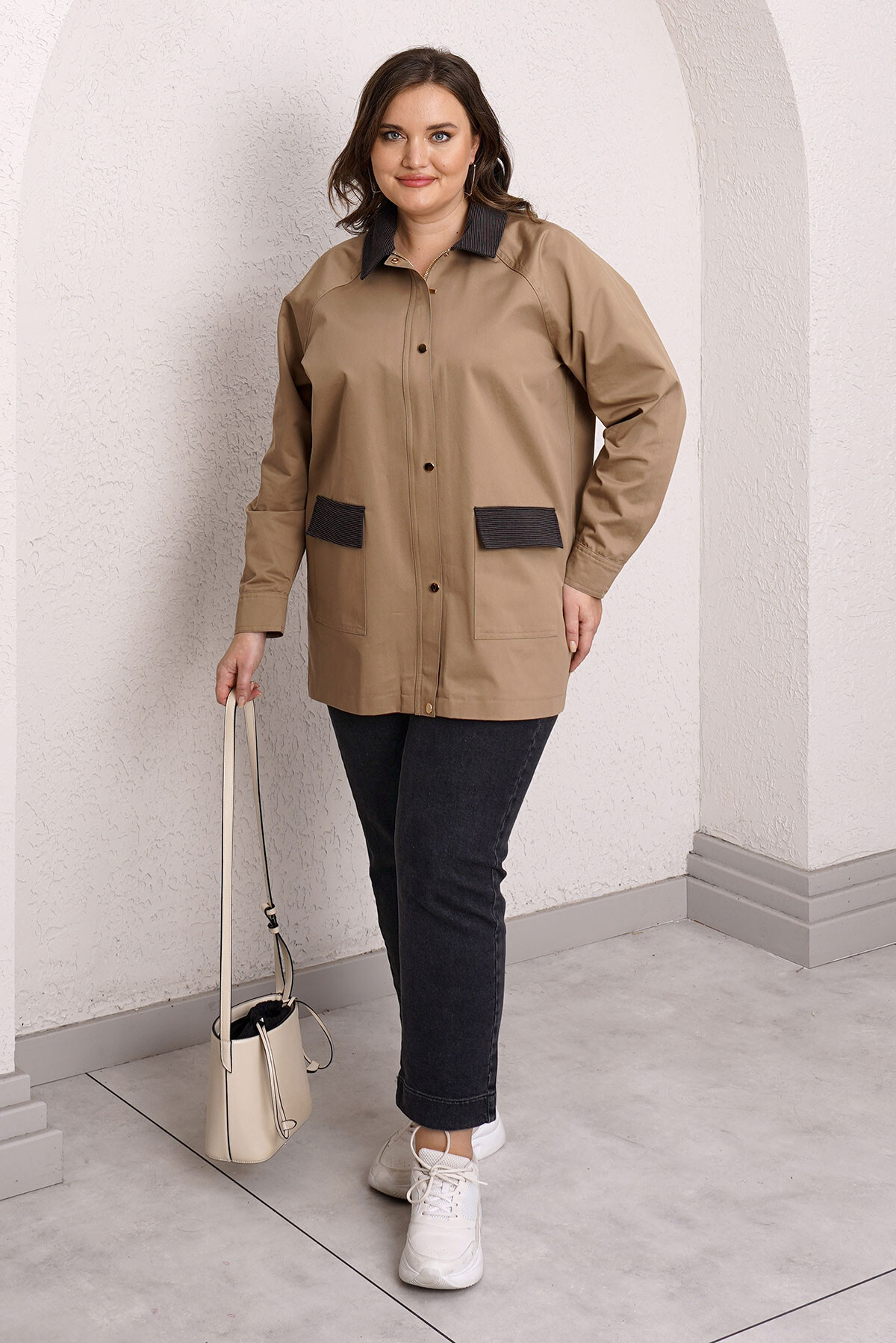 Plus size trench coat made of 100% cotton fabric.