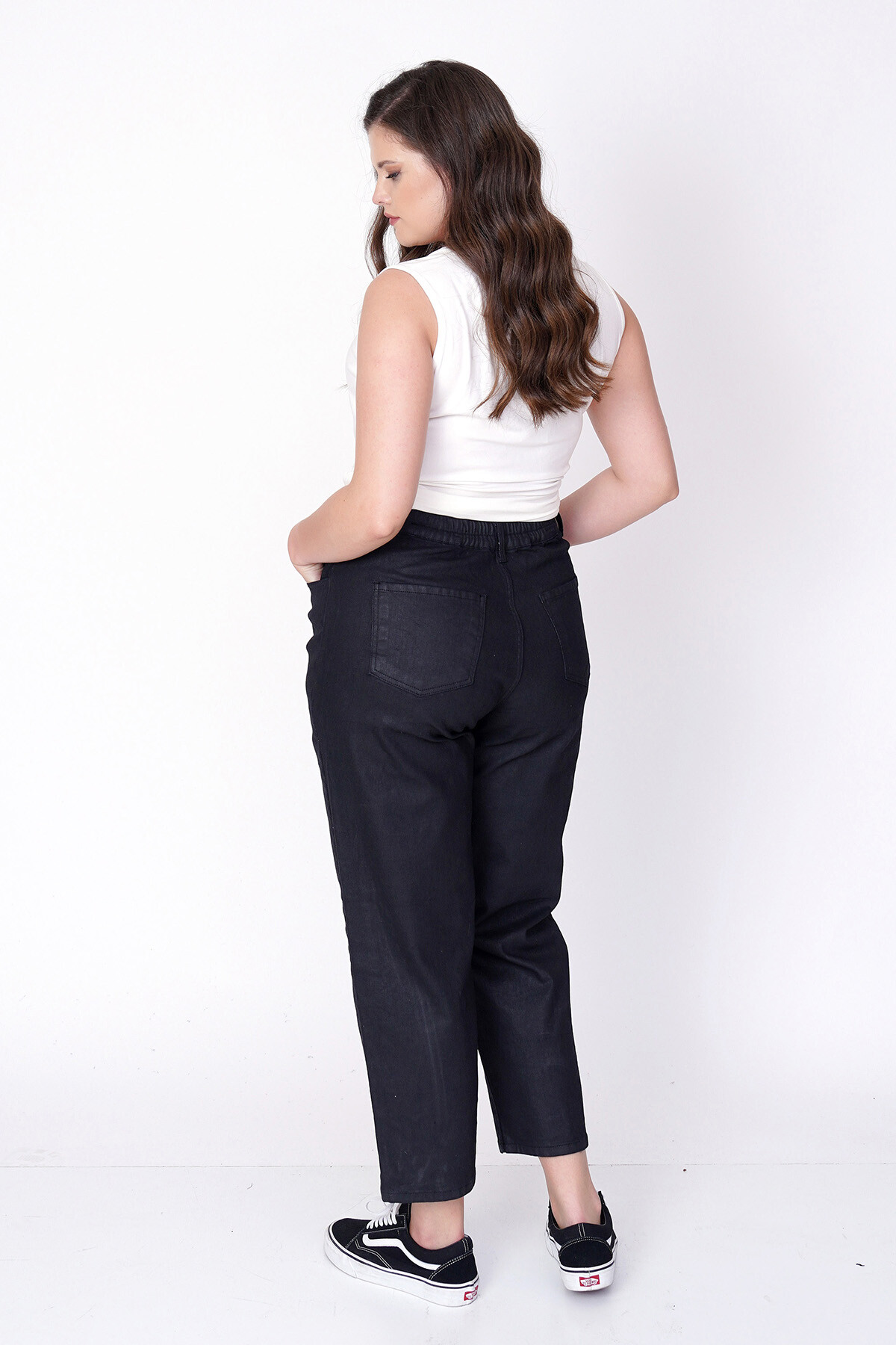 YÜKSEK BEL DERİ GÖRÜNÜMLÜ MOM JEAN